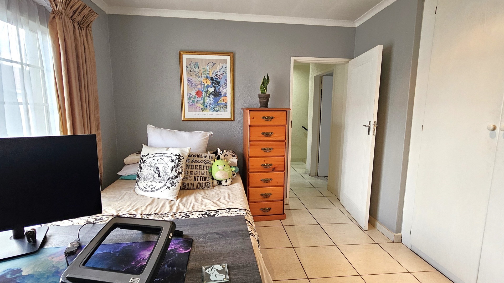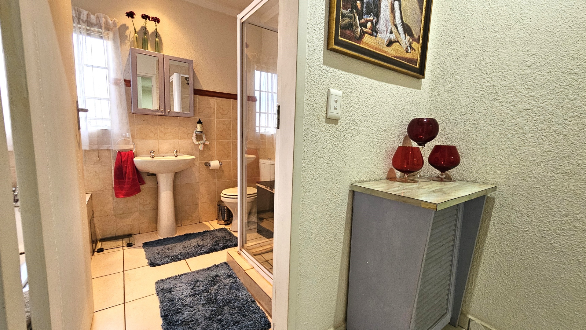 Upstairs, two well-proportioned bedrooms and bathroom ensure privacy and comfort. Each bedroom benefits from ample natural light and includes built-in wardrobes, providing essential storage. The bathrooms are fully tiled, offering a clean and functional aesthetic.