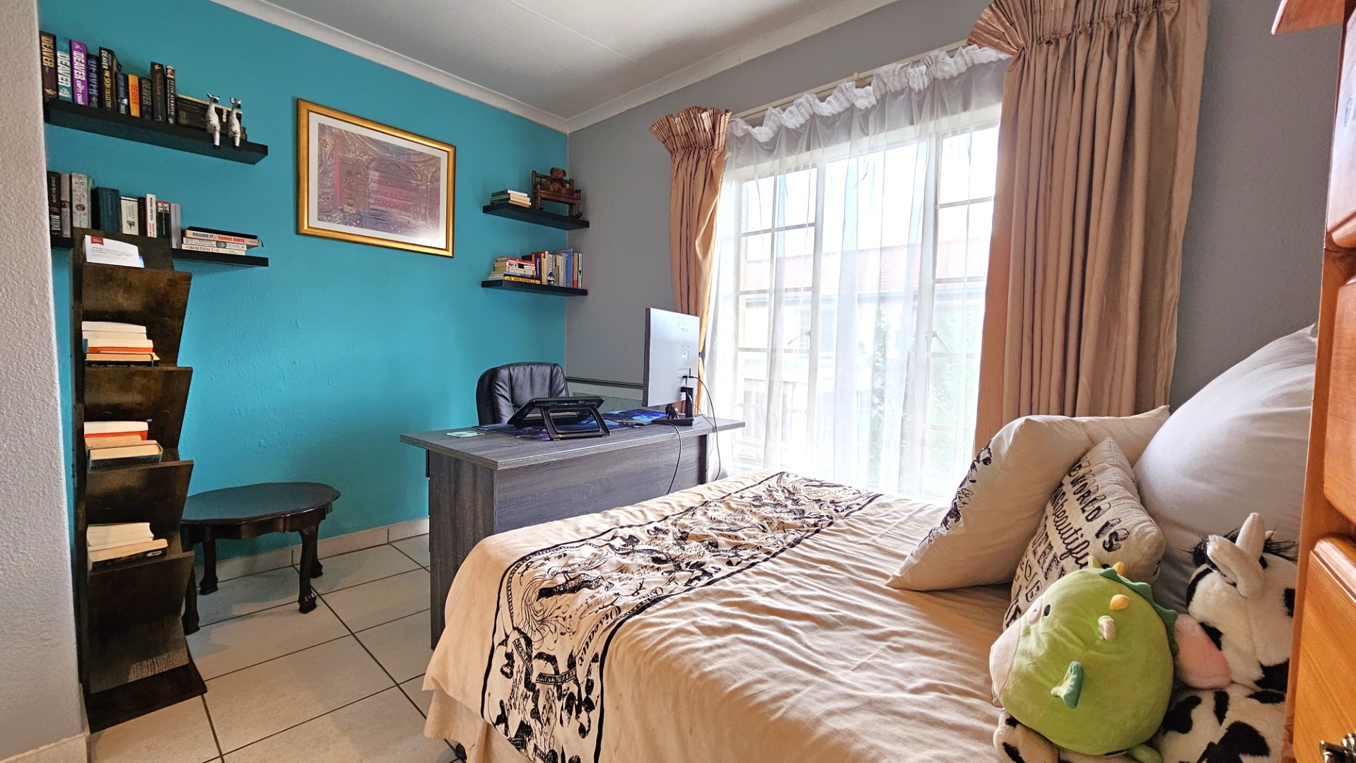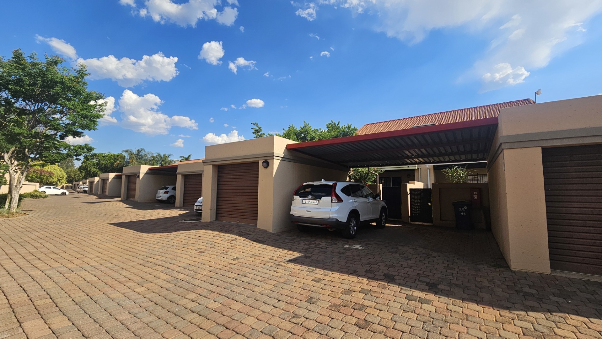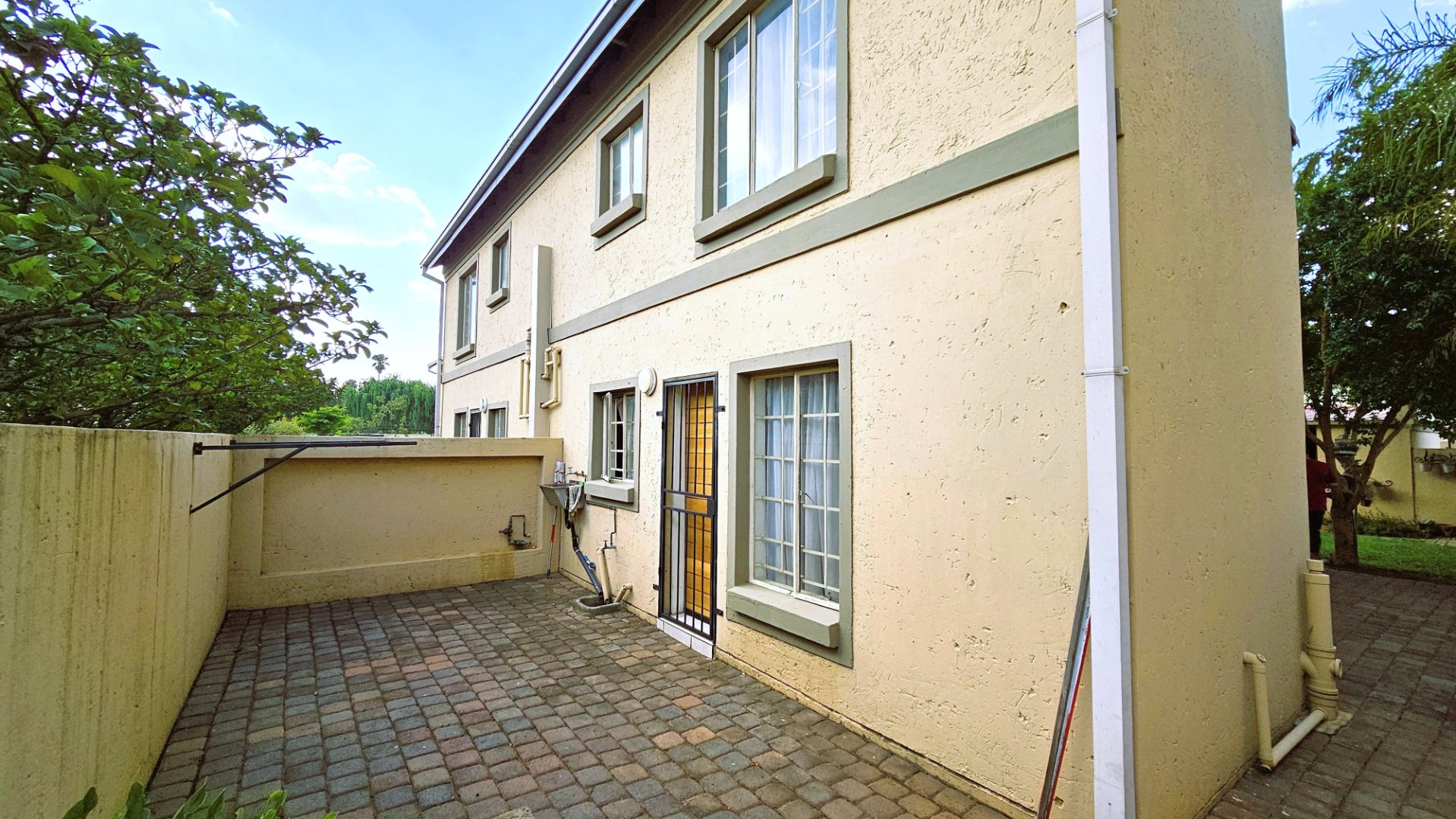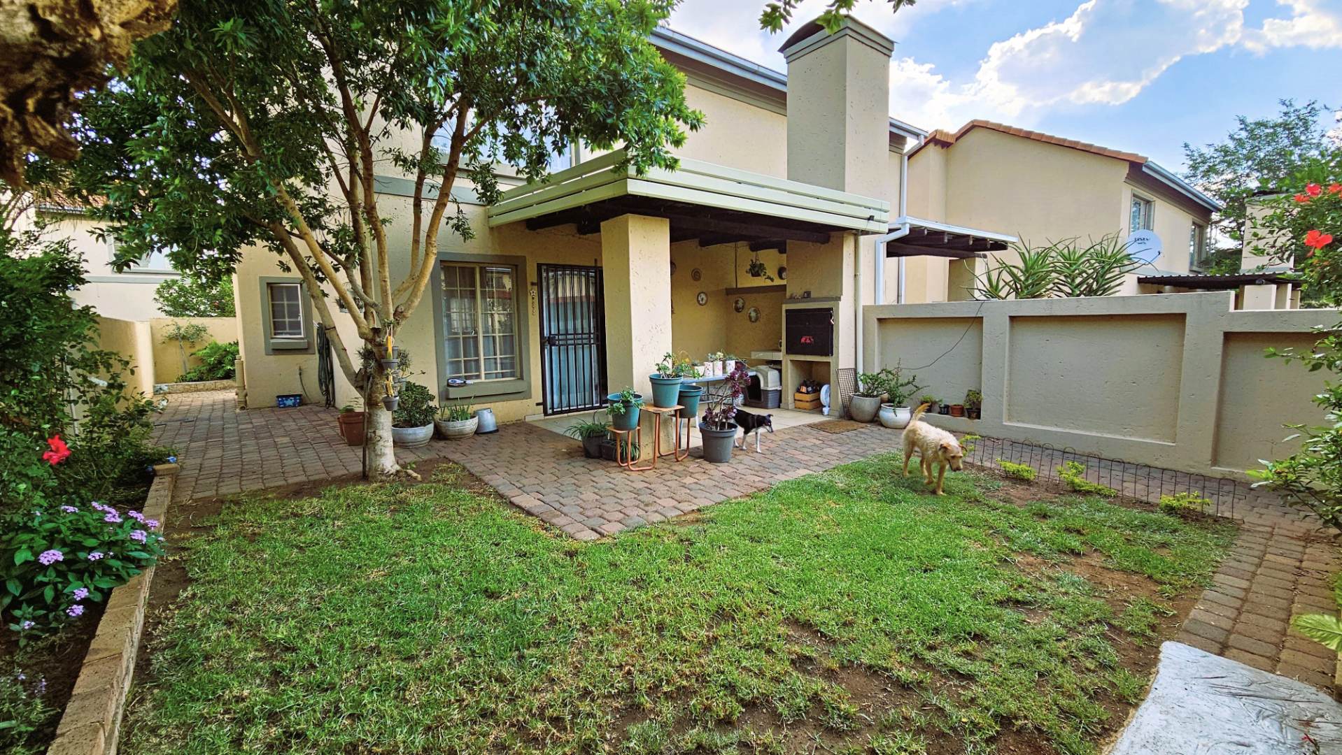 Step outside to a private garden area, complete with a covered patio and a built-in braai, perfect for outdoor enjoyment. The property is pet-friendly, and two dedicated parking spaces are provided. For peace of mind, the unit features an access gate and burglar bars on the sliding doors, enhancing security.