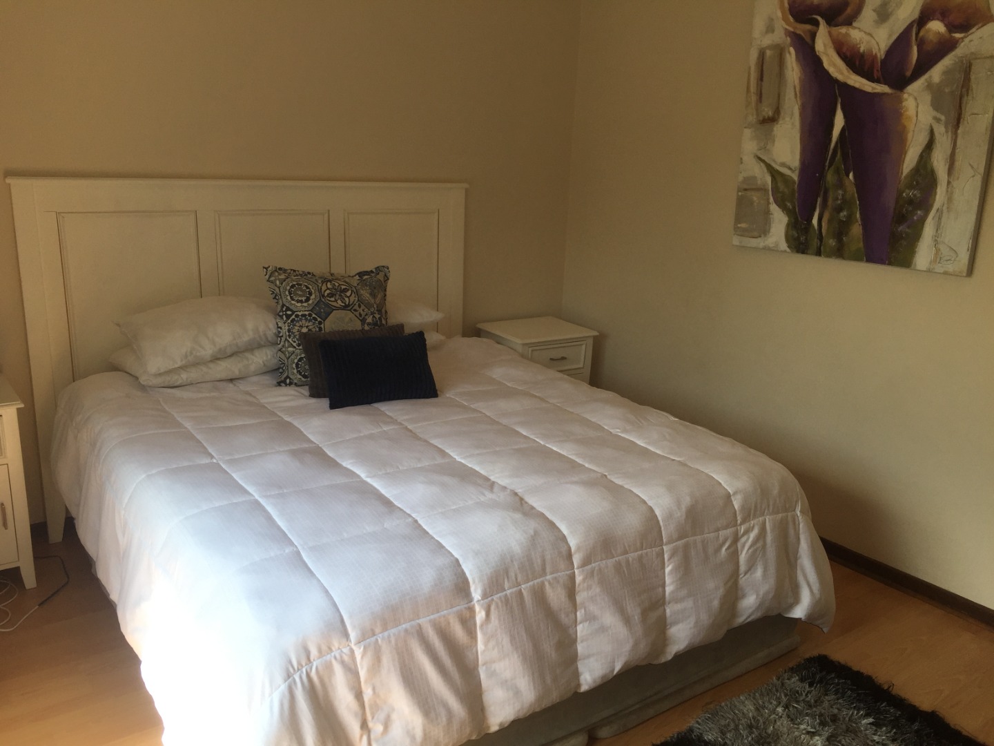 This furnished 3-bedroom, 2-bathroom residence offers comfortable and secure living within a prestigious golf estate in Woodhill, Pretoria. The property features a spacious open-plan living area, ideal for relaxation and entertaining, complemented by a dedicated dining room. The modern kitchen is well-appointed with light wood-grain cabinetry, dark countertops, and essential stainless steel appliances including a refrigerator, built-in oven, hob, and extractor fan, ensuring a functional and stylish culinary space.