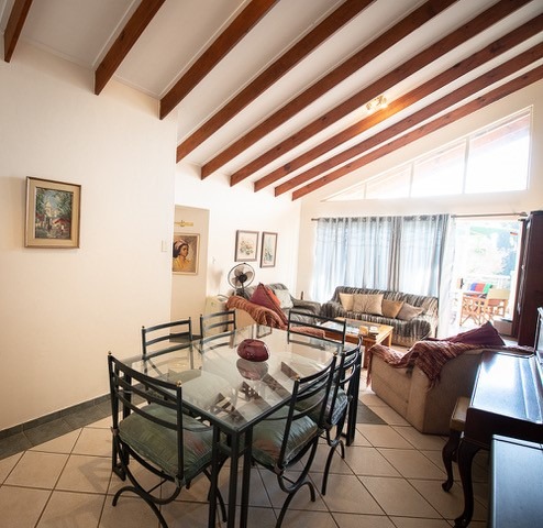 Discover comfortable living in this inviting 3-bedroom, 2-bathroom residence available for rent in the prestigious Woodhill Golf Estate, Pretoria. The home features an open-plan lounge and dining area, enhanced by high vaulted ceilings with exposed wooden beams and abundant natural light, creating a spacious and airy atmosphere. The functional kitchen boasts ample counter space, a convenient breakfast bar, and essential appliances including a stove and microwave. A dedicated utility area further accommodates a large refrigerator, oven, dishwasher, washing machine, and tumble dryer, ensuring all your household needs are met. Each of the three bedrooms offers comfortable accommodation, with built-in wardrobes providing practical storage solutions.