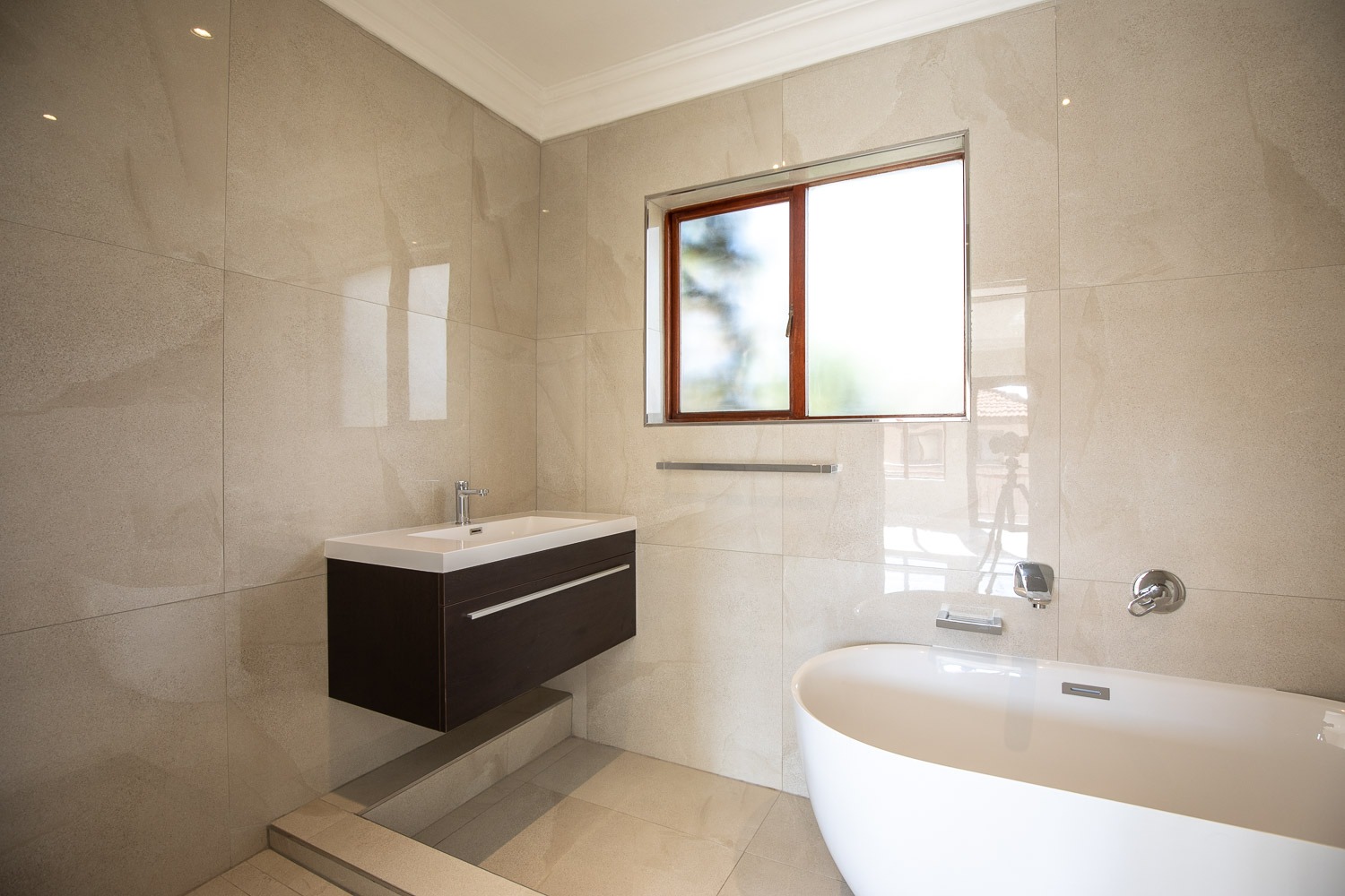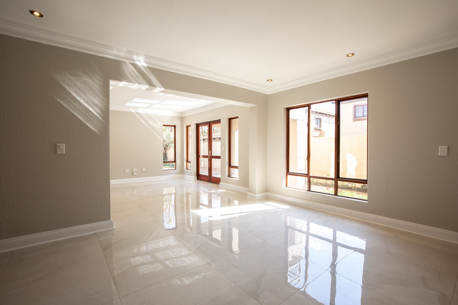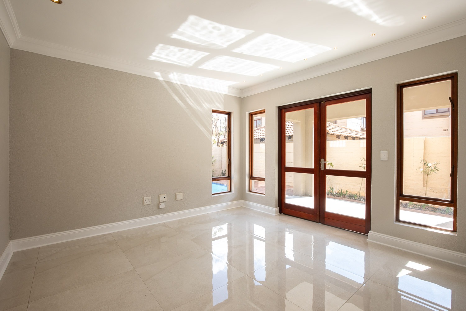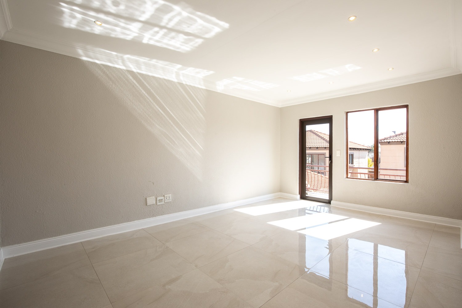 Designed for comfortable living, this unfurnished home is perfect for families or professionals seeking a secure and pet-friendly environment. Step outside to a private oasis featuring a sparkling swimming pool and a brick-paved patio, ideal for outdoor entertaining and enjoying the South African climate. A well-maintained garden provides a tranquil setting, while an upper-level balcony offers additional outdoor space. The property also benefits from a double garage and additional parking, providing practical convenience.