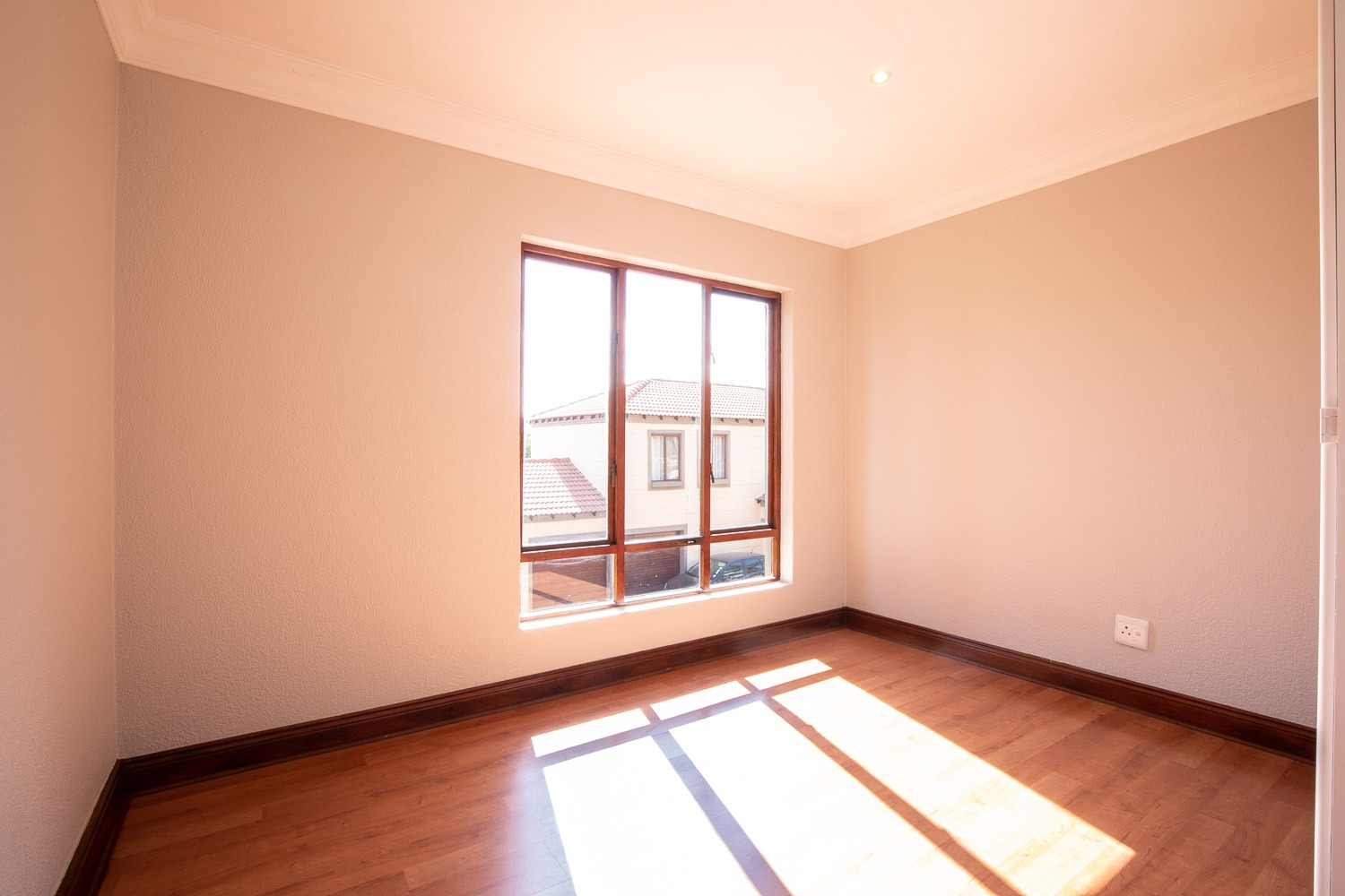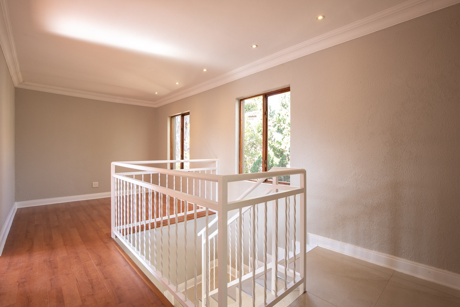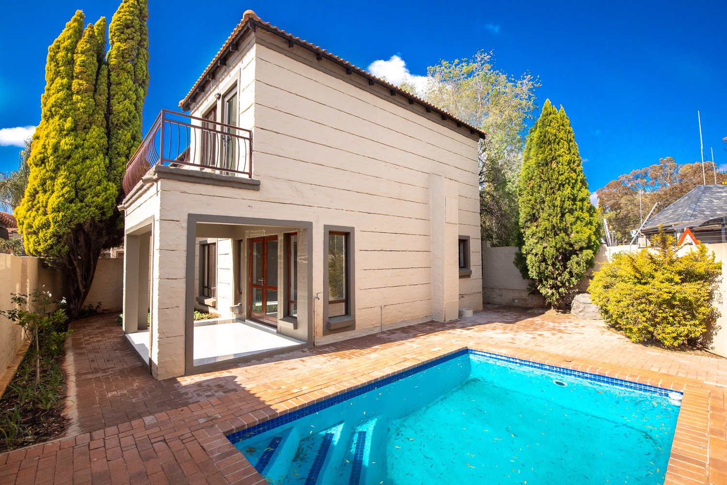 Designed for comfortable living, this unfurnished home is perfect for families or professionals seeking a secure and pet-friendly environment. Step outside to a private oasis featuring a sparkling swimming pool and a brick-paved patio, ideal for outdoor entertaining and enjoying the South African climate. A well-maintained garden provides a tranquil setting, while an upper-level balcony offers additional outdoor space. The property also benefits from a double garage and additional parking, providing practical convenience.