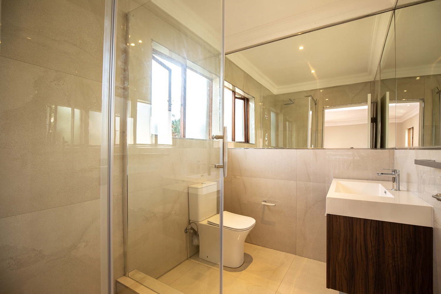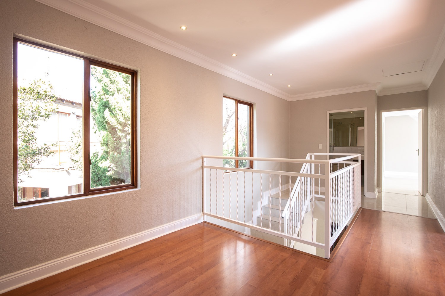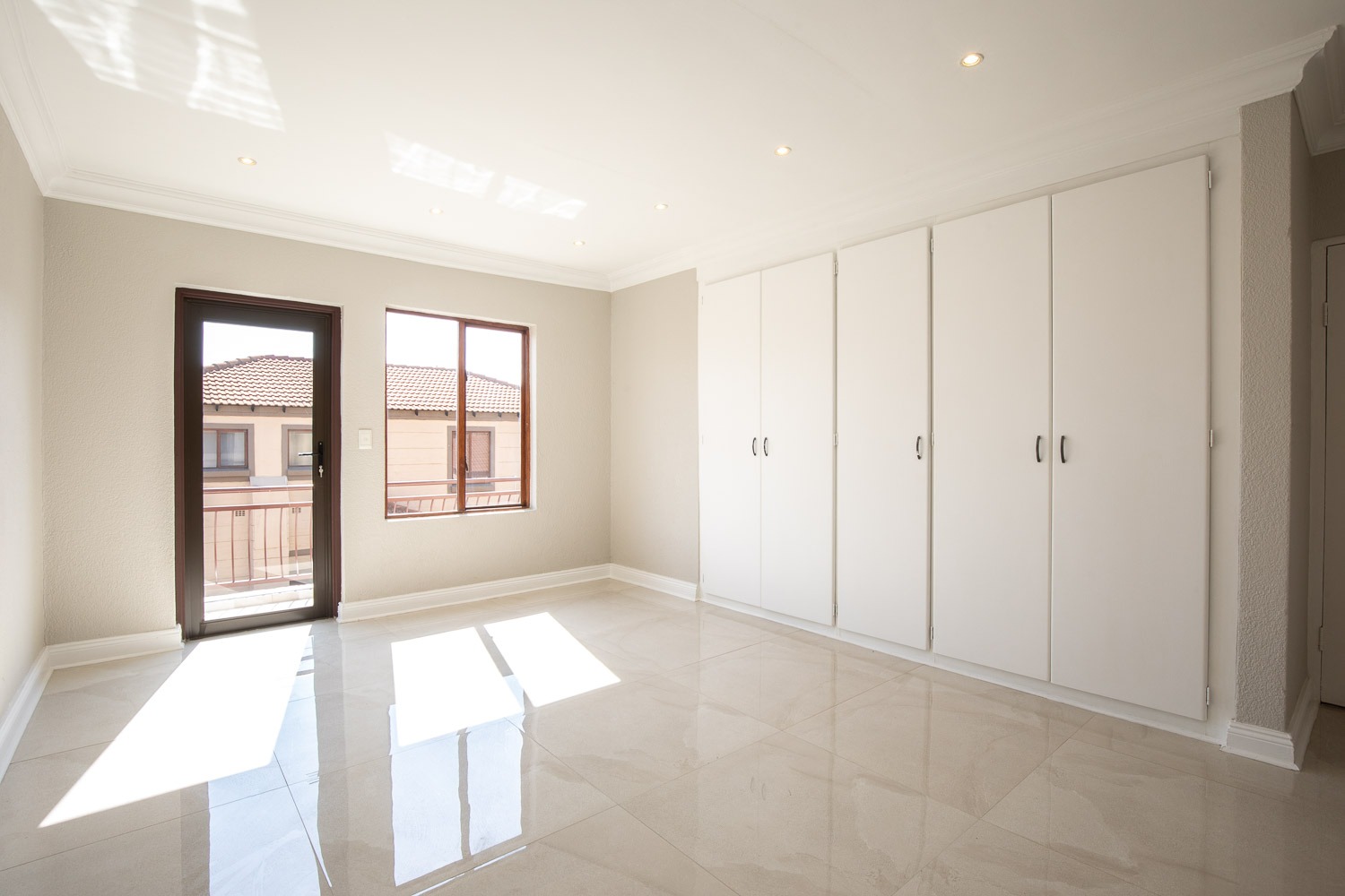 Designed for comfortable living, this unfurnished home is perfect for families or professionals seeking a secure and pet-friendly environment. Step outside to a private oasis featuring a sparkling swimming pool and a brick-paved patio, ideal for outdoor entertaining and enjoying the South African climate. A well-maintained garden provides a tranquil setting, while an upper-level balcony offers additional outdoor space. The property also benefits from a double garage and additional parking, providing practical convenience.