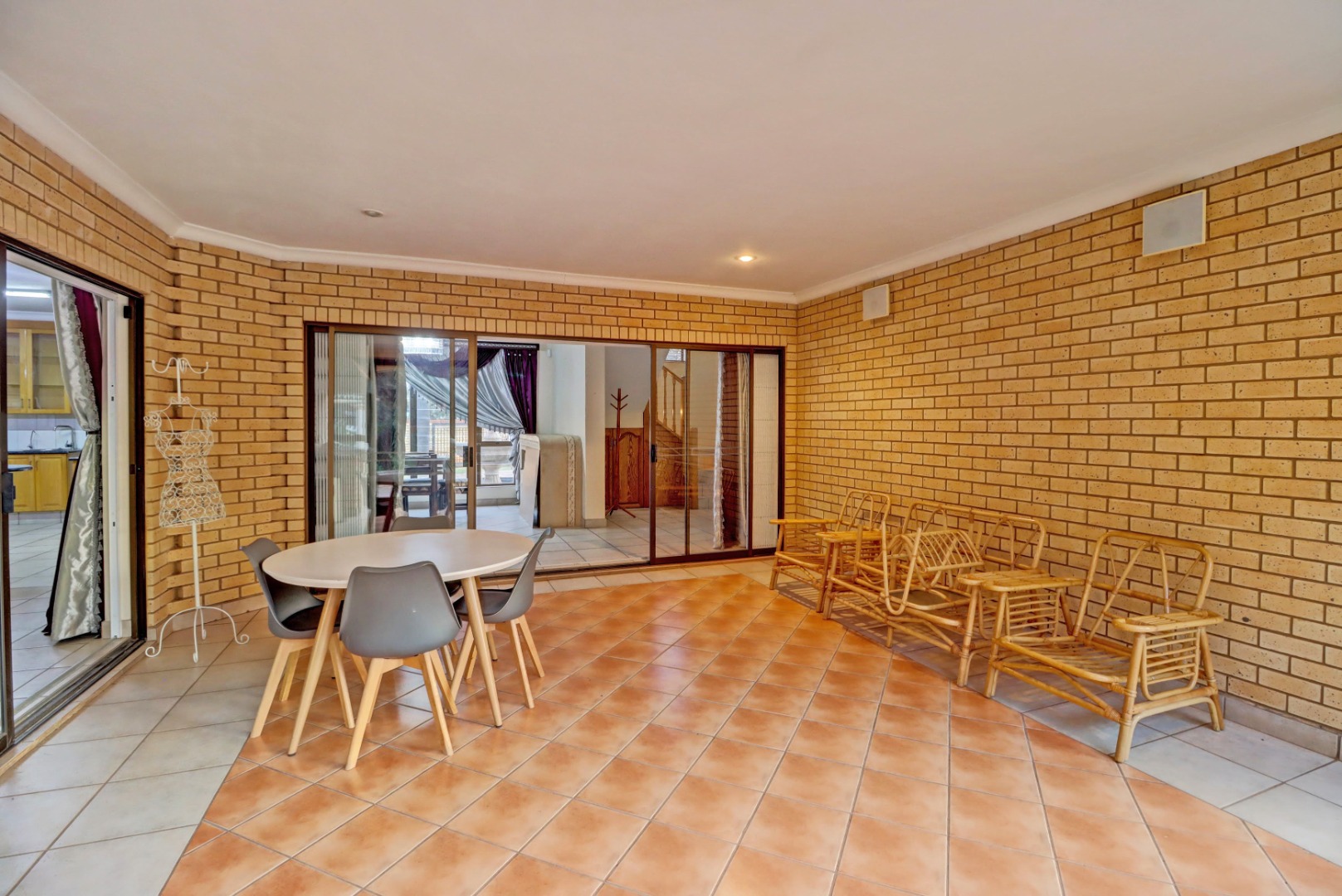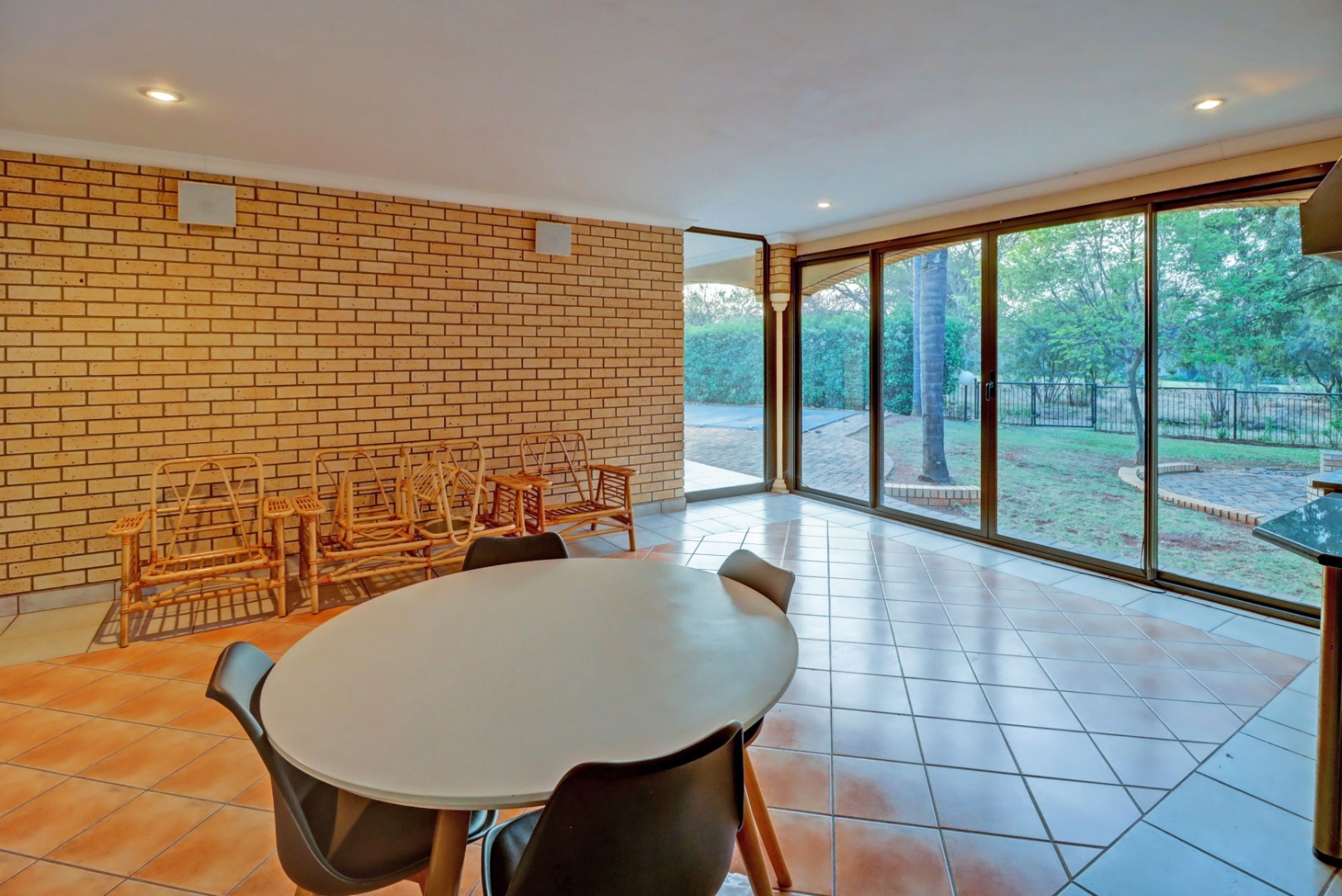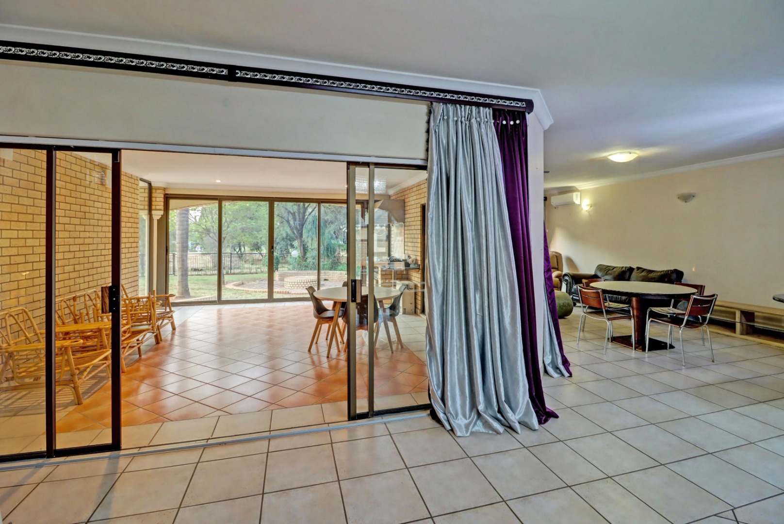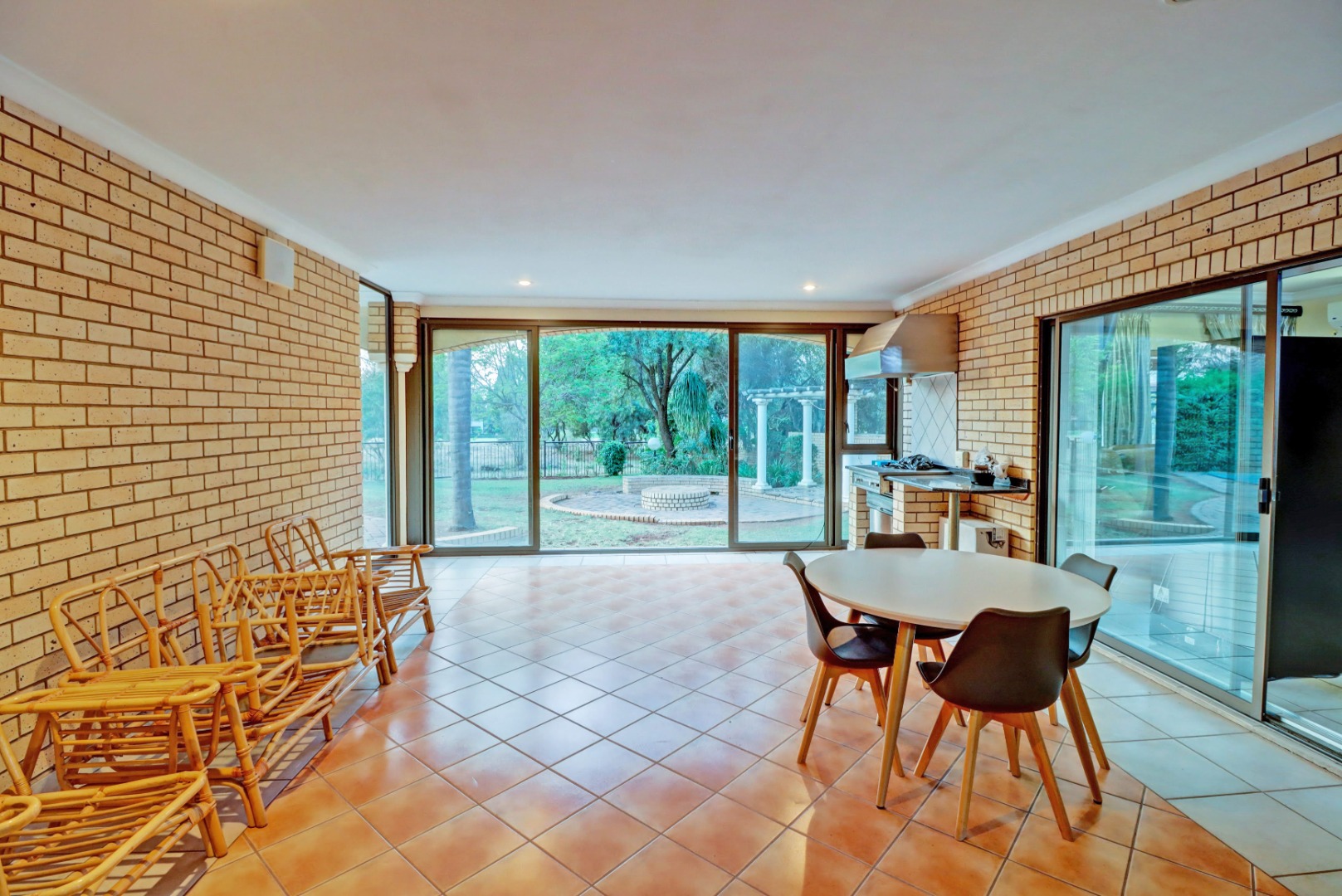 covered patio that overlooks the sparkling swimming pool and garden, that is perfect for those chilly winter night or summer days for wanting to entertain around the pool.