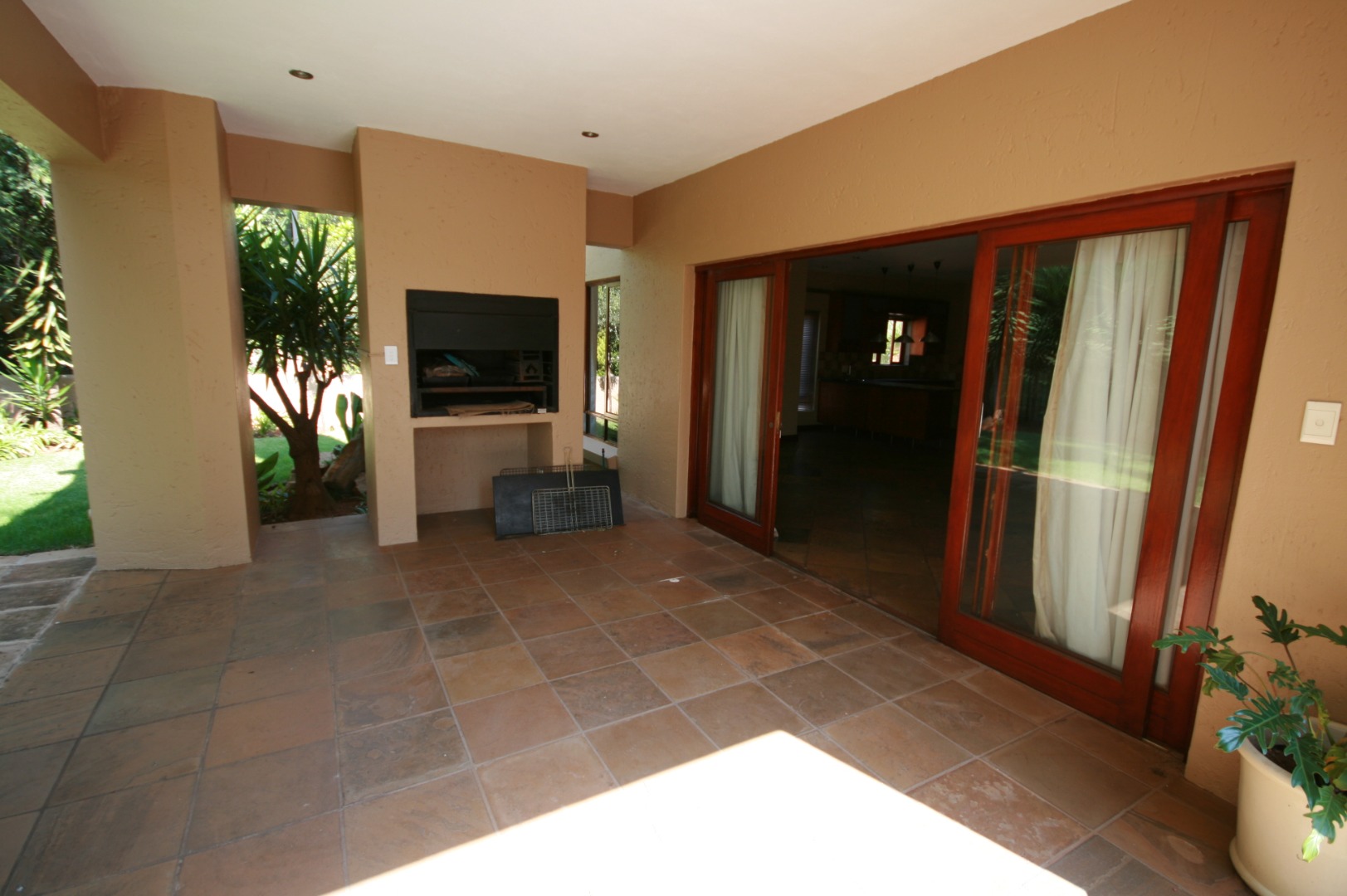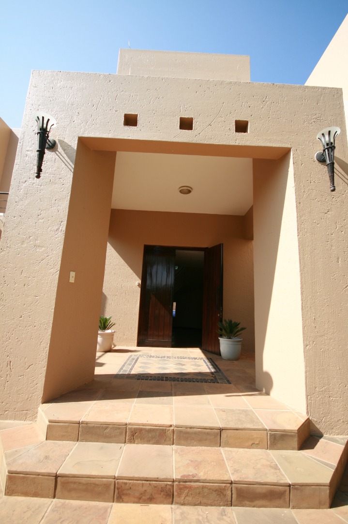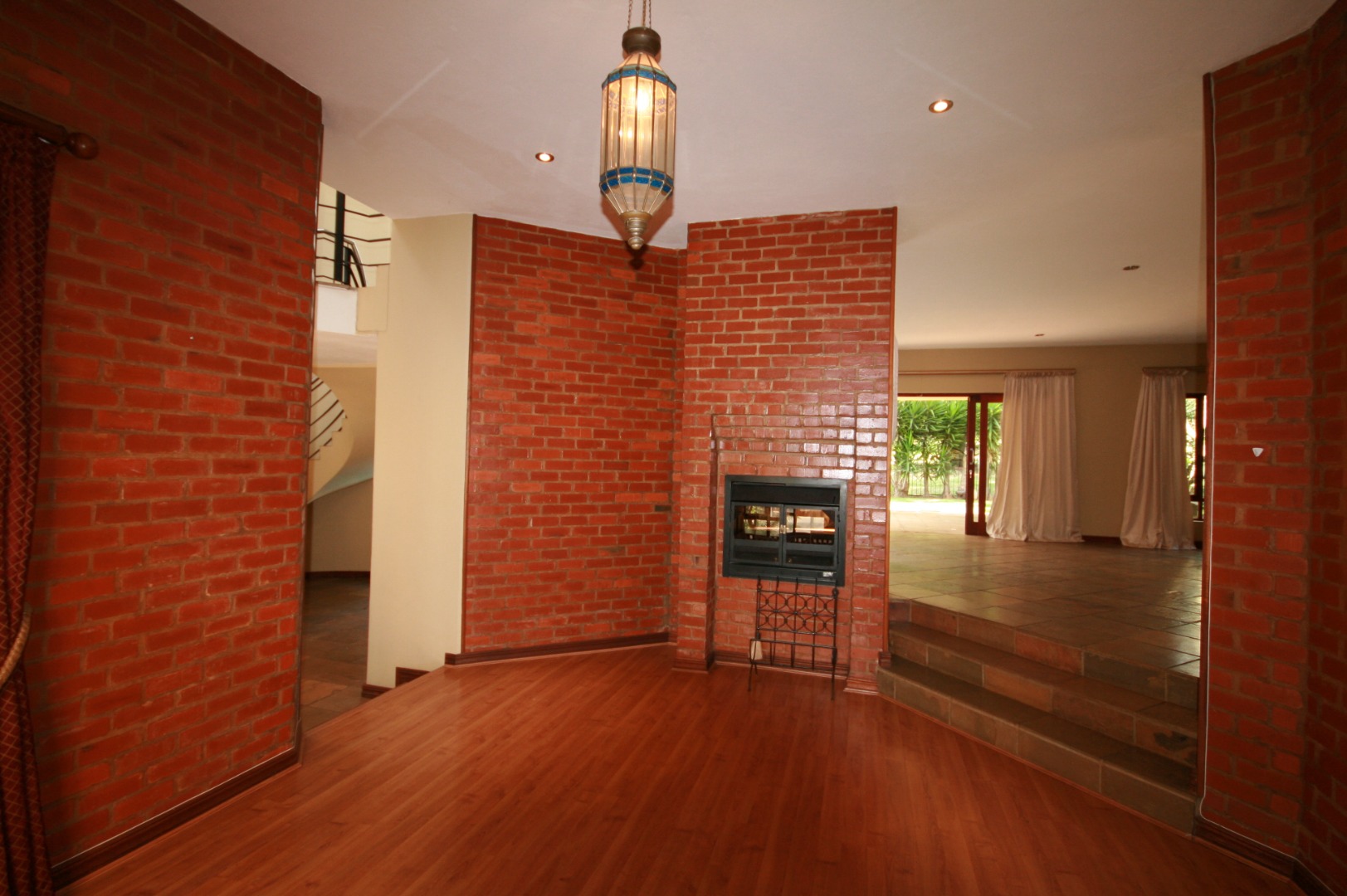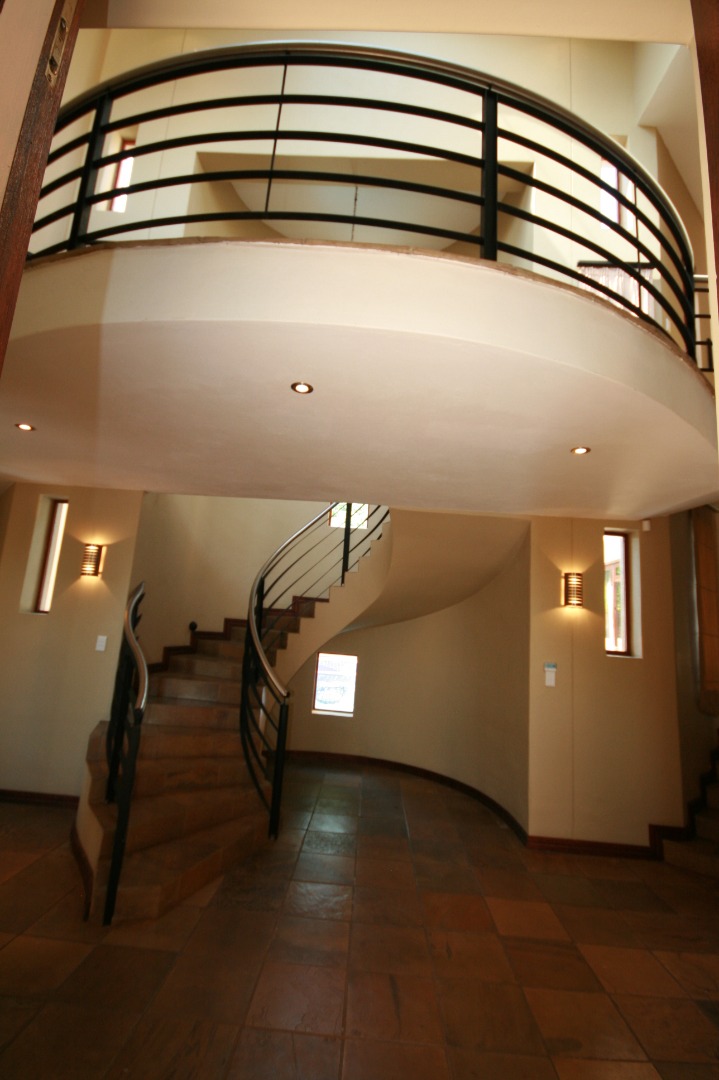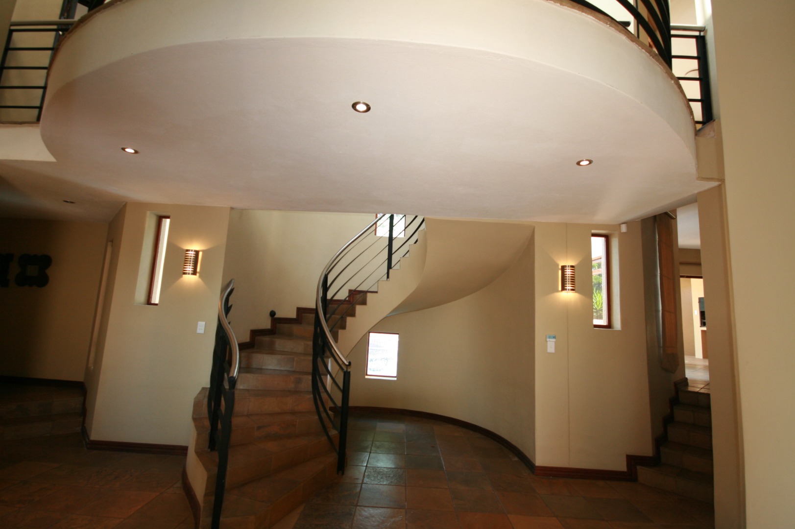 Step into this magnificent 4-bedroom, 3-bathroom residence, available for rent in the esteemed Woodhill Golf Estate, Pretoria. The property welcomes you with a grand, arch-covered entrance and a spacious foyer featuring high ceilings and an elegant spiral staircase with modern metal railings, leading to a curved upper-level balcony. This fully furnished home boasts three generous lounges, a dedicated dining room, and a well-appointed kitchen, providing ample space for comfortable living and entertaining. The interior showcases a blend of modern design and rustic charm with durable tiled flooring and contemporary fixtures.