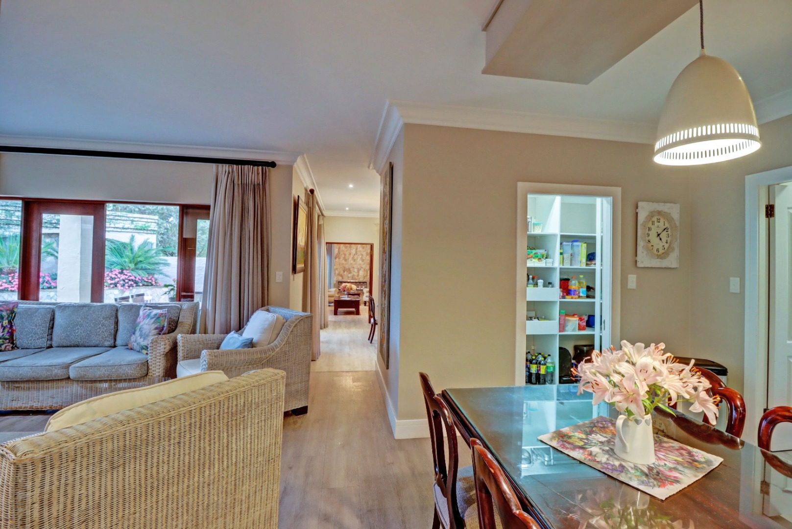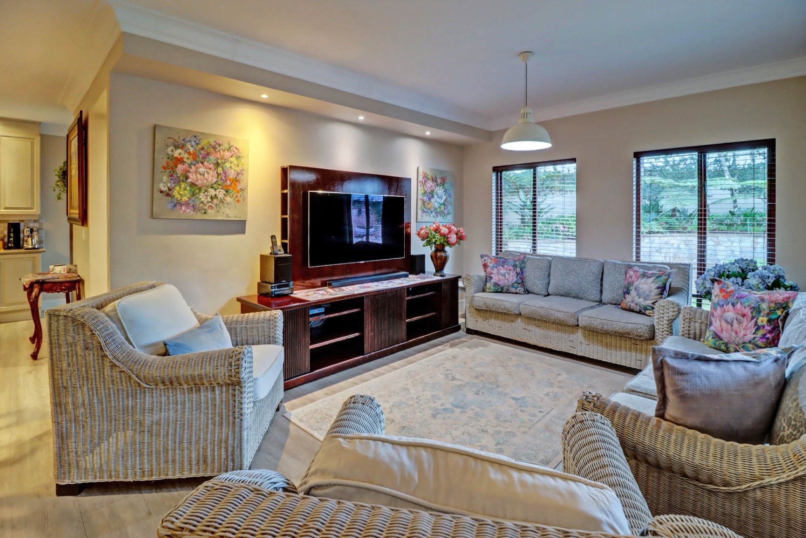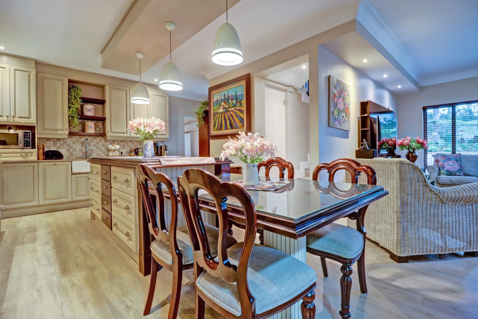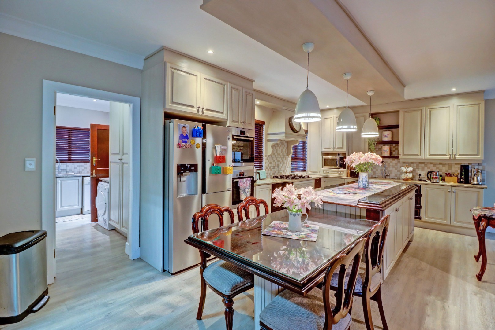 Accommodation comprises four well-proportioned bedrooms and three bathrooms, with two of these being en-suite, providing privacy and convenience. Additionally, the property includes staff quarters, adding to its practical appeal. Thoughtful amenities such as air conditioning, a cosy fireplace, and a battery inverter ensure comfort and uninterrupted living, while fibre connectivity supports modern digital demands. Pets are welcome, making this a truly inclusive family residence.
