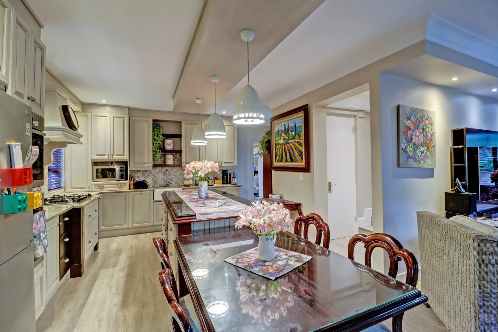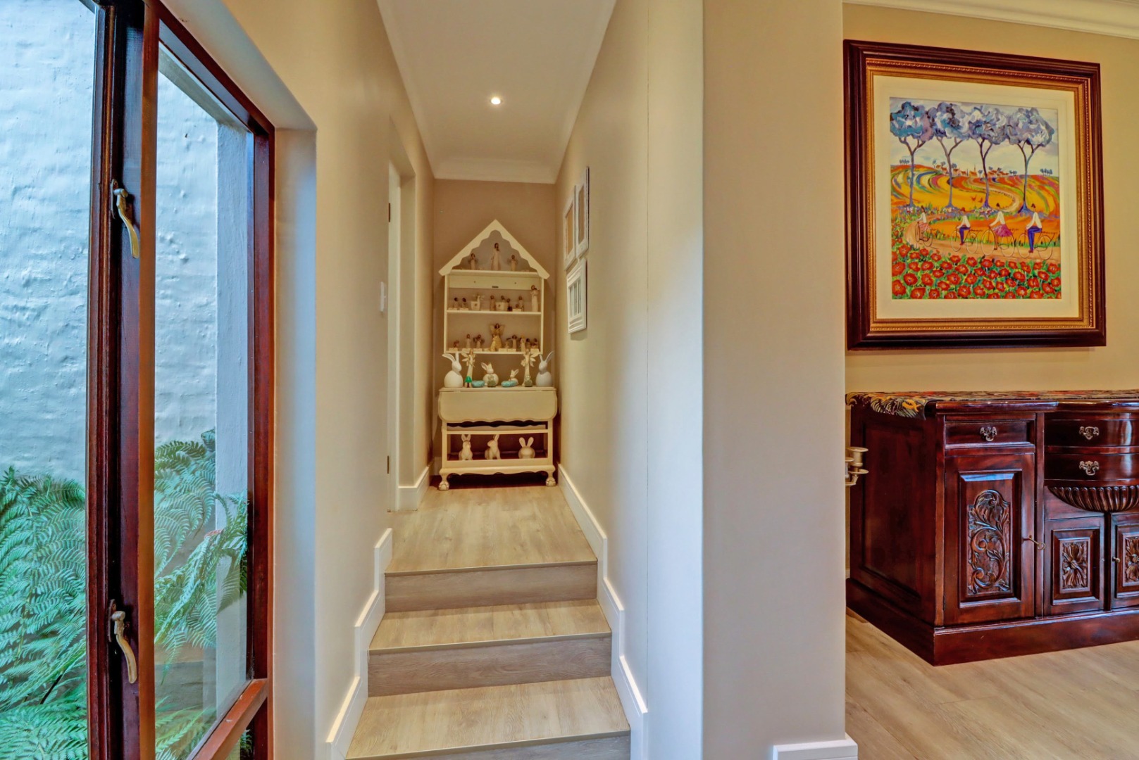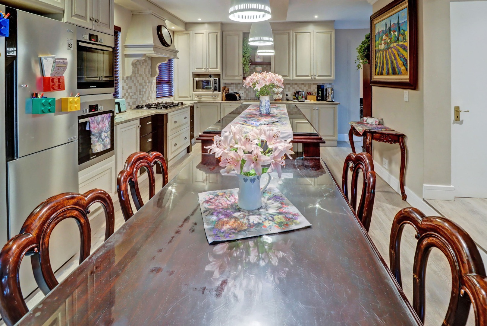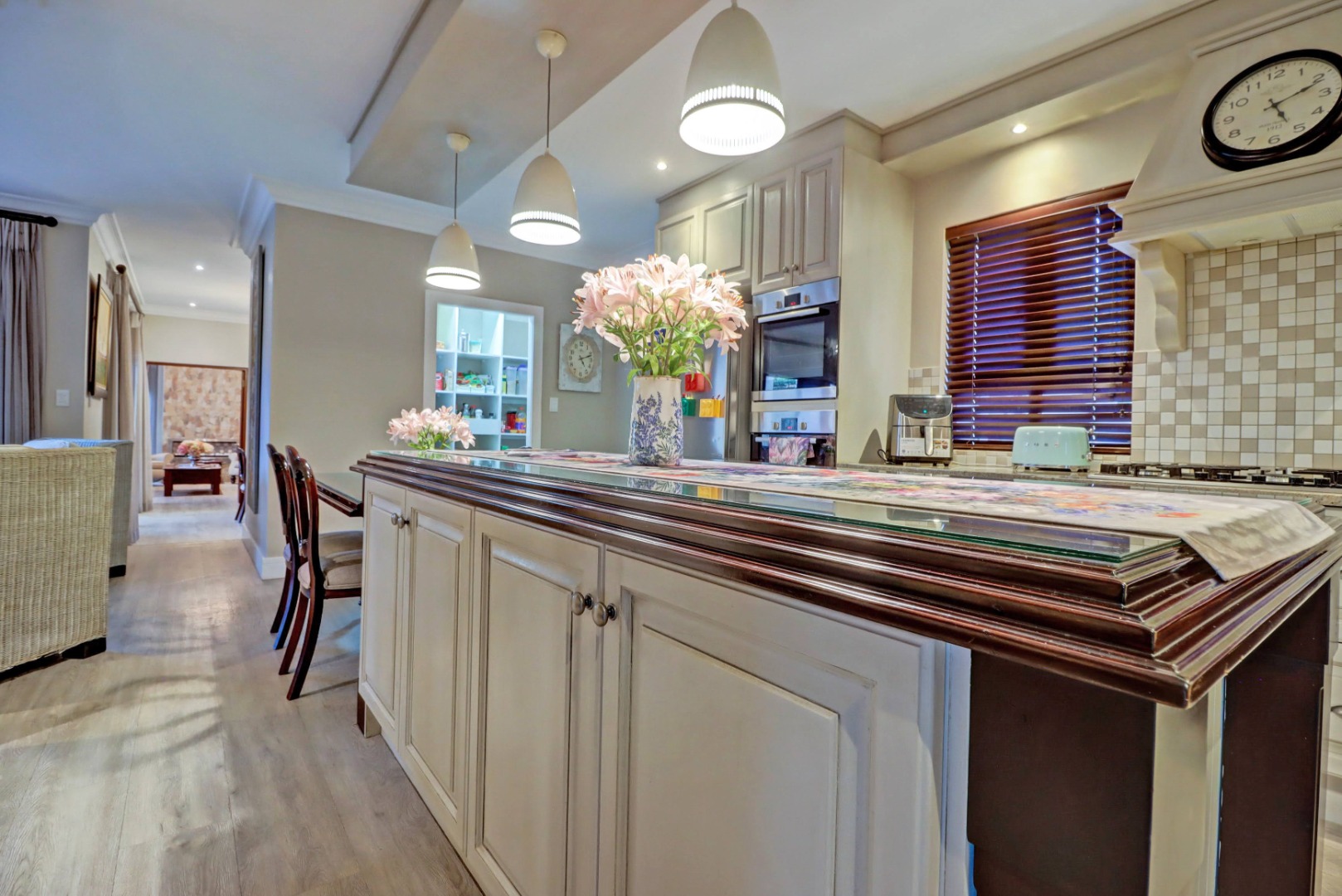Accommodation comprises four well-proportioned bedrooms and three bathrooms, with two of these being en-suite, providing privacy and convenience. Additionally, the property includes staff quarters, adding to its practical appeal. Thoughtful amenities such as air conditioning, a cosy fireplace, and a battery inverter ensure comfort and uninterrupted living, while fibre connectivity supports modern digital demands. Pets are welcome, making this a truly inclusive family residence.