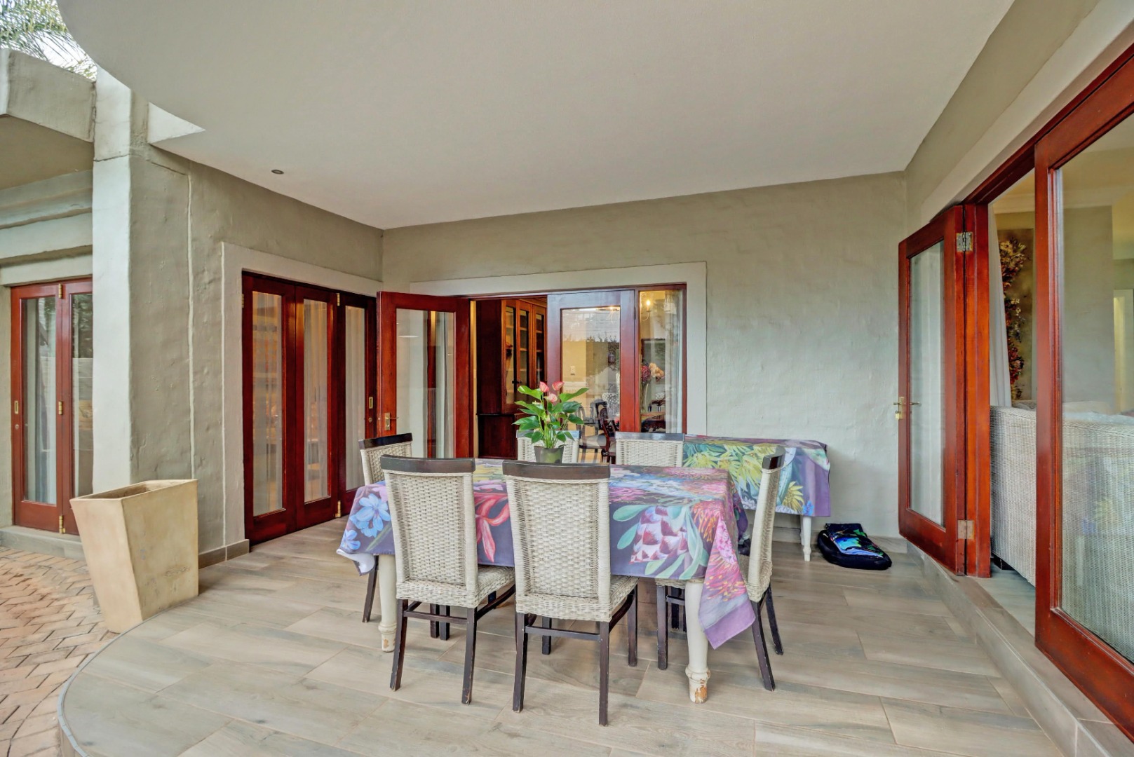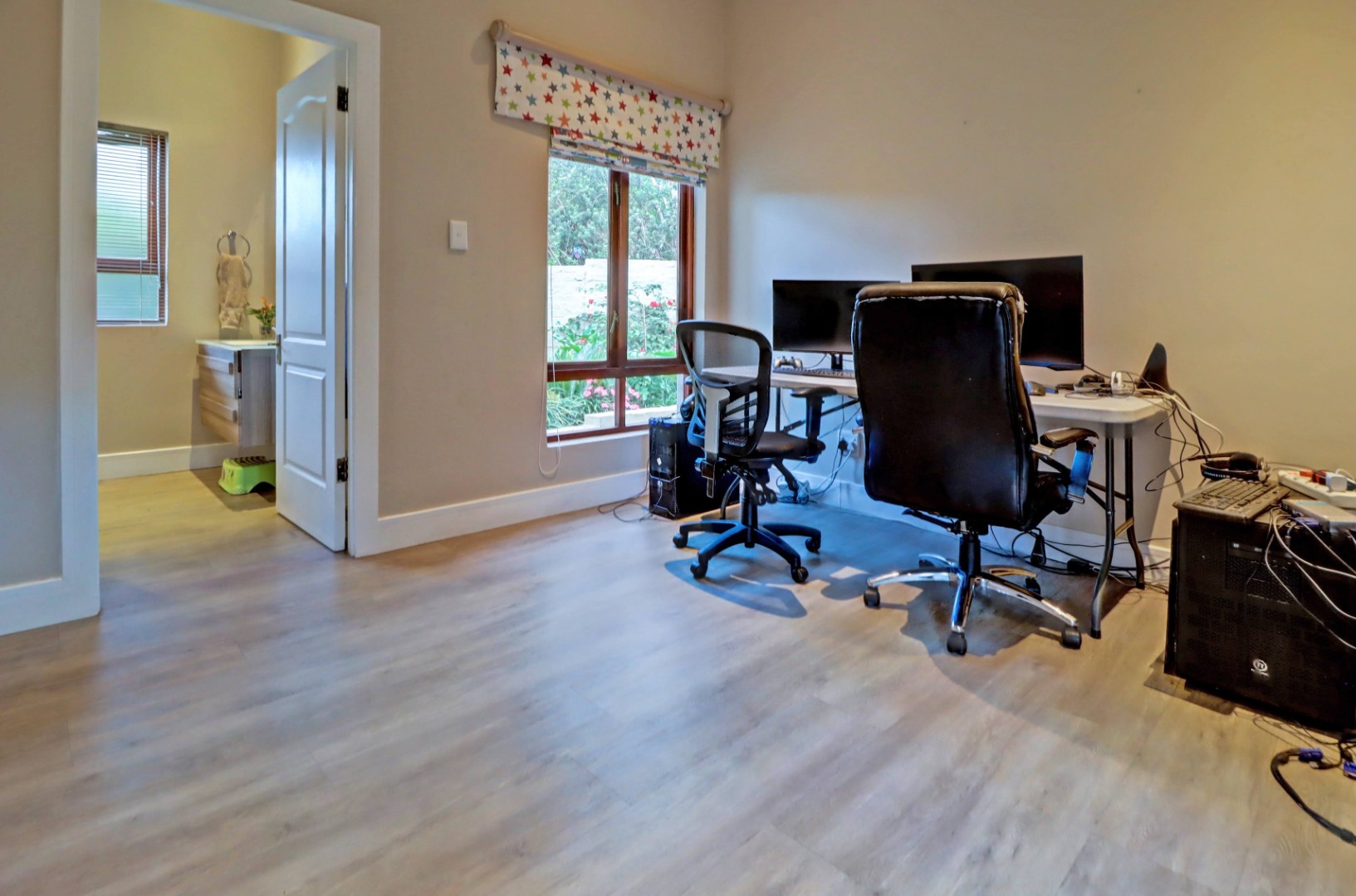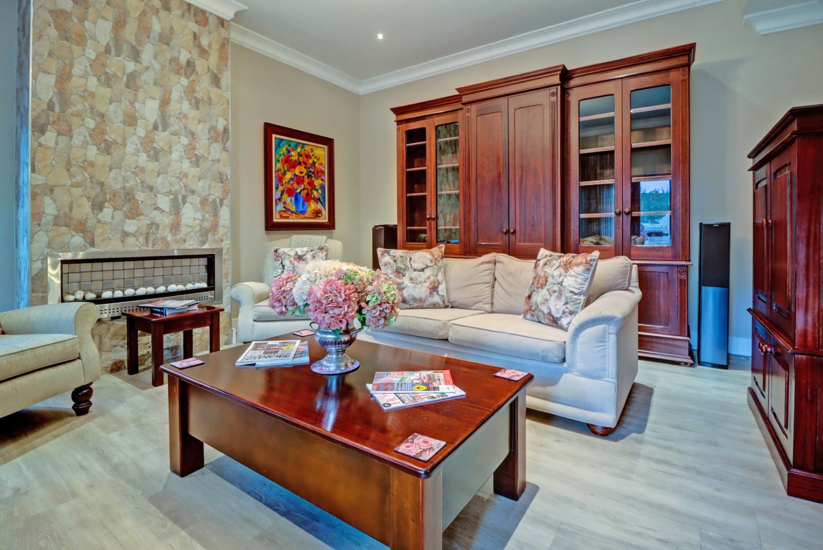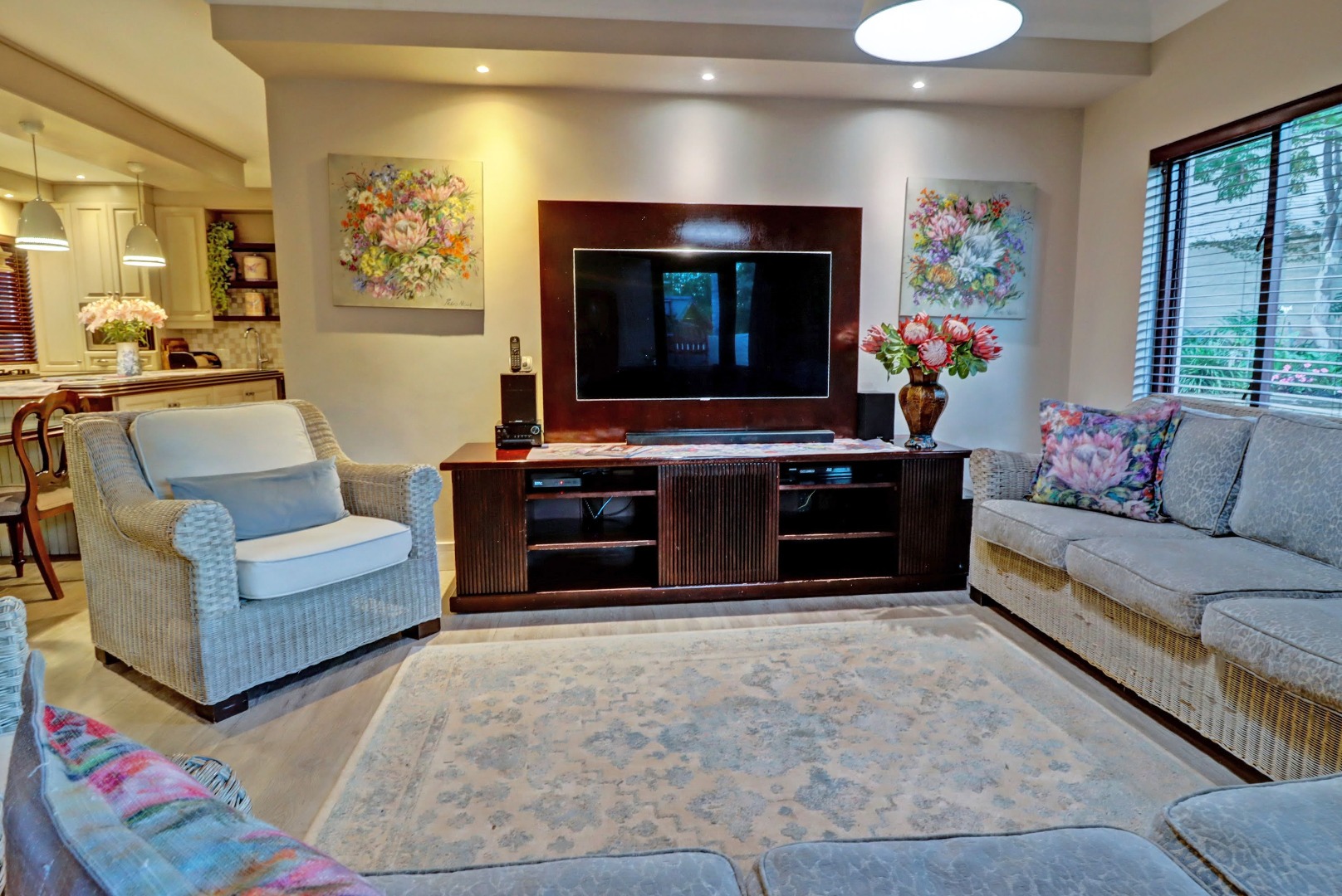 Accommodation comprises four well-proportioned bedrooms and three bathrooms, with two of these being en-suite, providing privacy and convenience. Additionally, the property includes staff quarters, adding to its practical appeal. Thoughtful amenities such as air conditioning, a cosy fireplace, and a battery inverter ensure comfort and uninterrupted living, while fibre connectivity supports modern digital demands. Pets are welcome, making this a truly inclusive family residence.