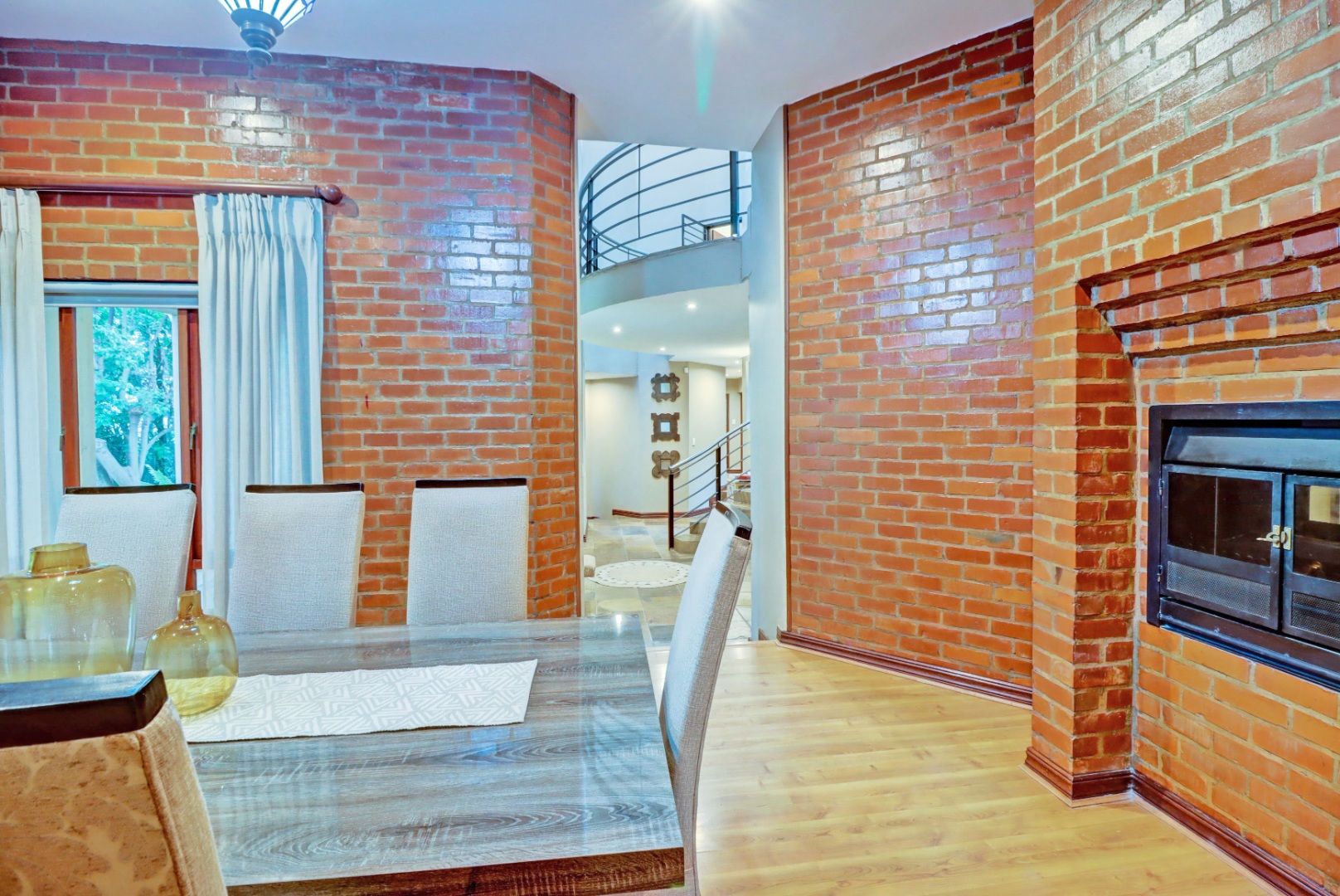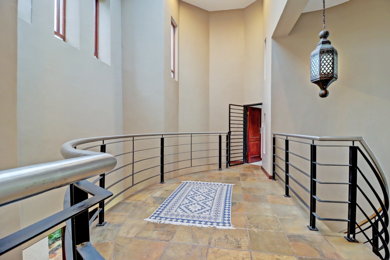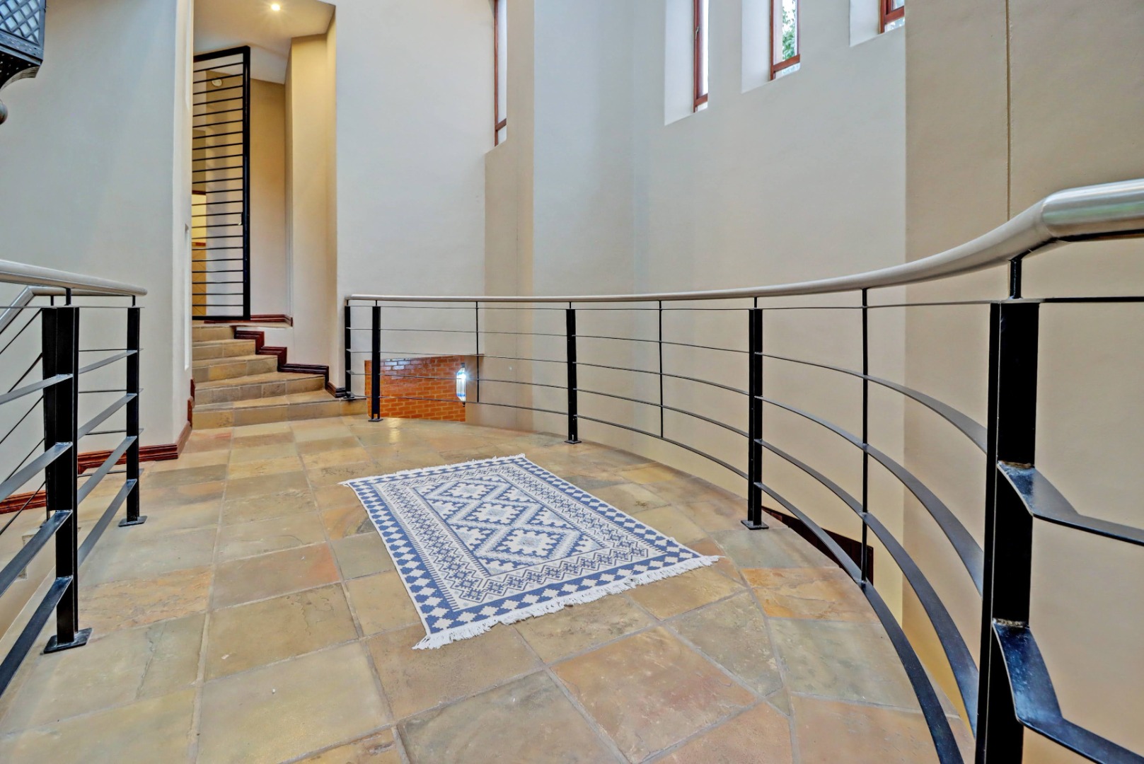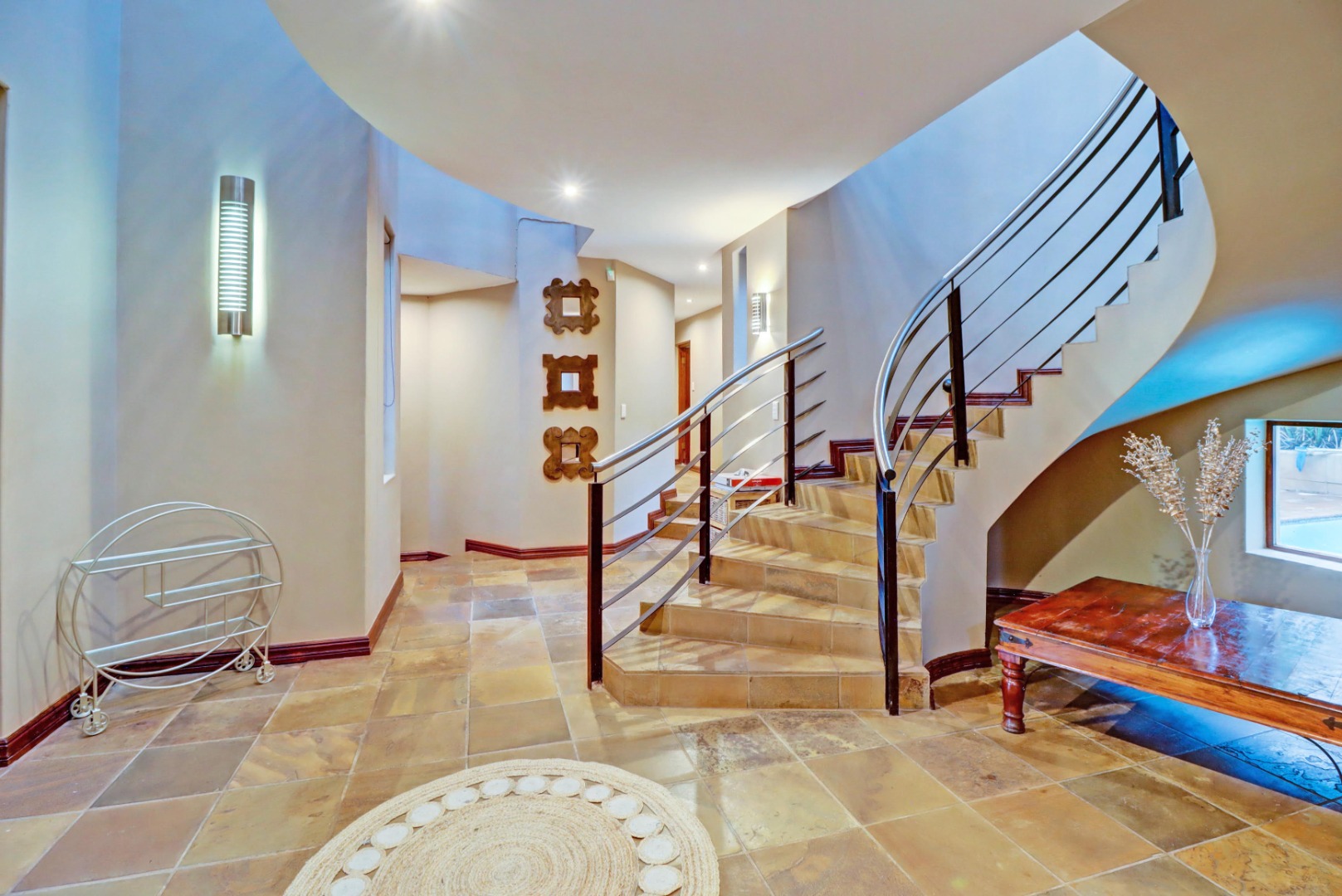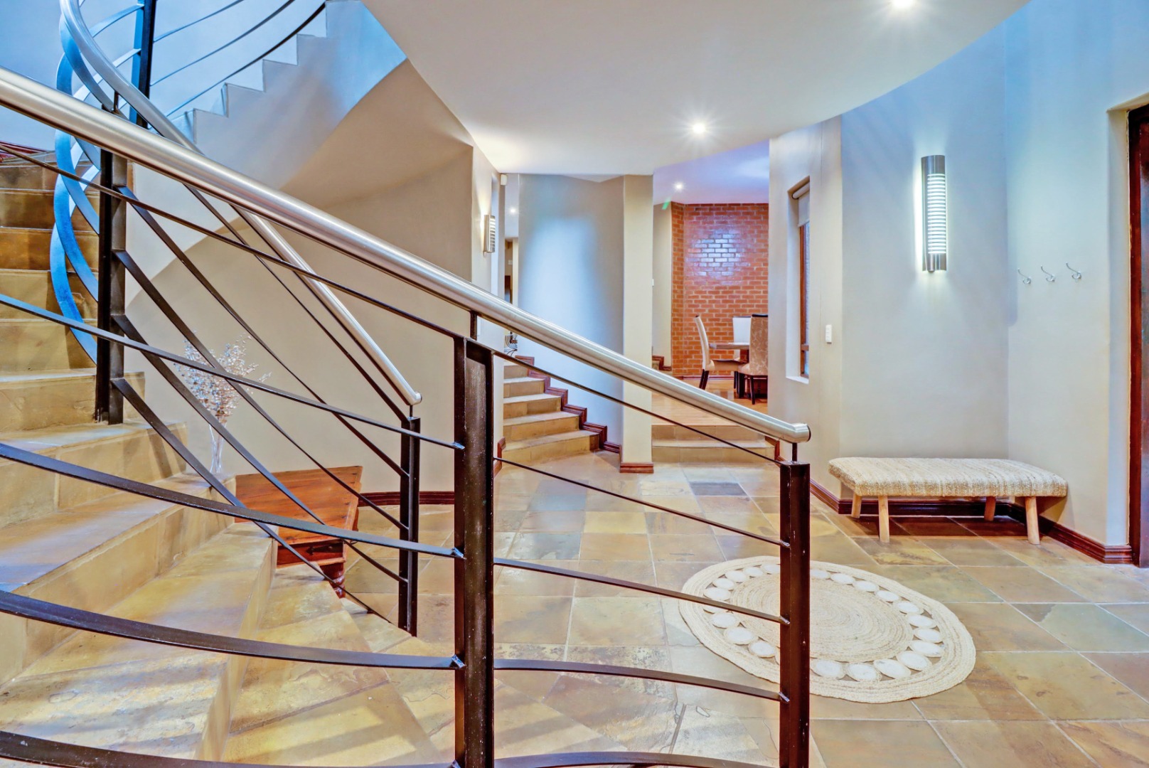 Step into this magnificent 4-bedroom, 3-bathroom residence, available for rent in the esteemed Woodhill Golf Estate, Pretoria. The property welcomes you with a grand, arch-covered entrance and a spacious foyer featuring high ceilings and an elegant spiral staircase with modern metal railings, leading to a curved upper-level balcony. This fully furnished home boasts three generous lounges, a dedicated dining room, and a well-appointed kitchen, providing ample space for comfortable living and entertaining. The interior showcases a blend of modern design and rustic charm with durable tiled flooring and contemporary fixtures.