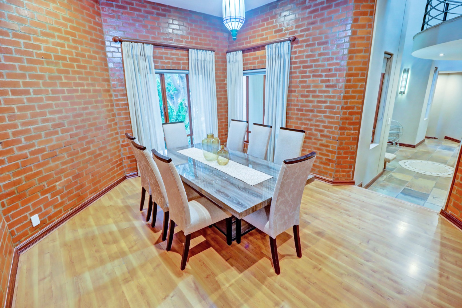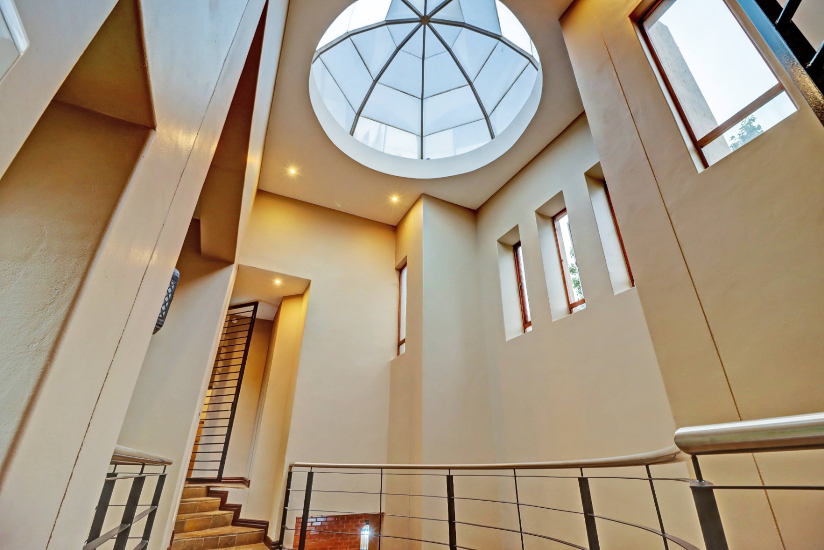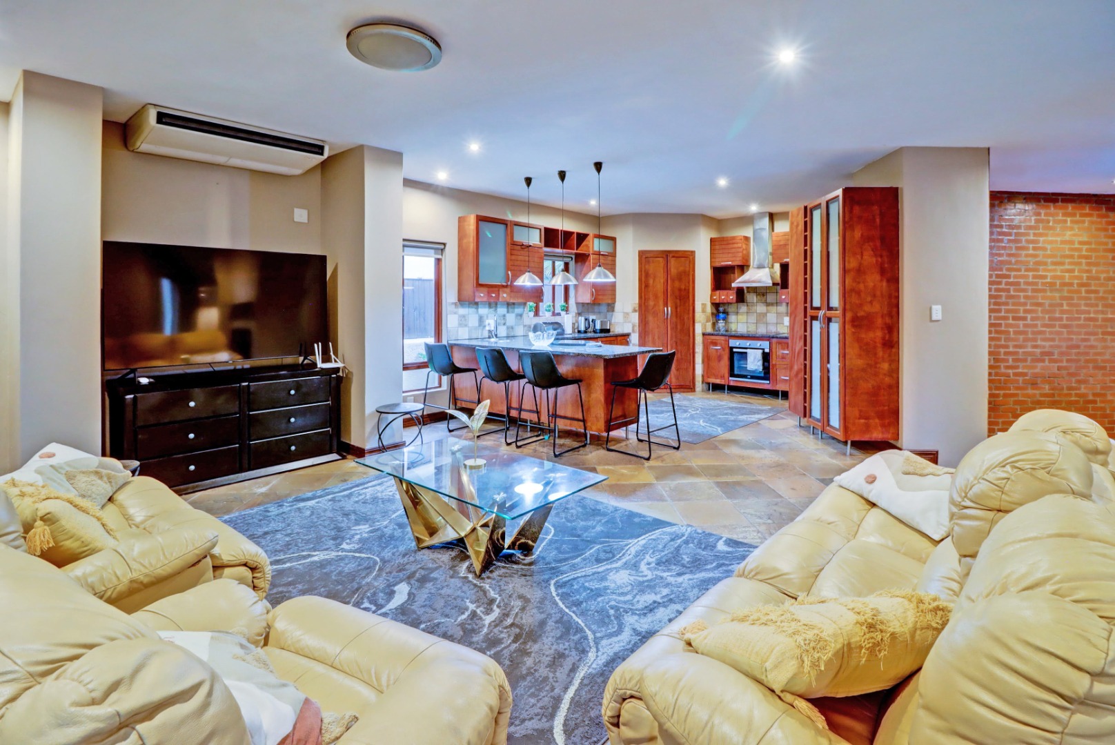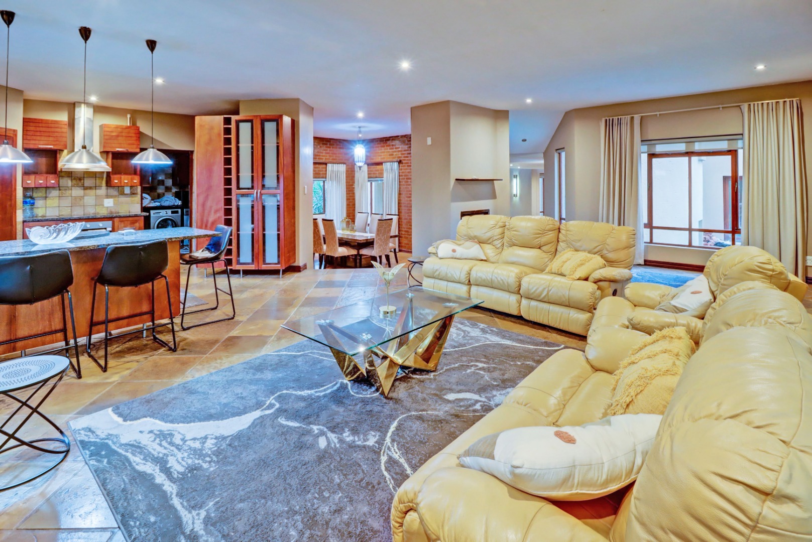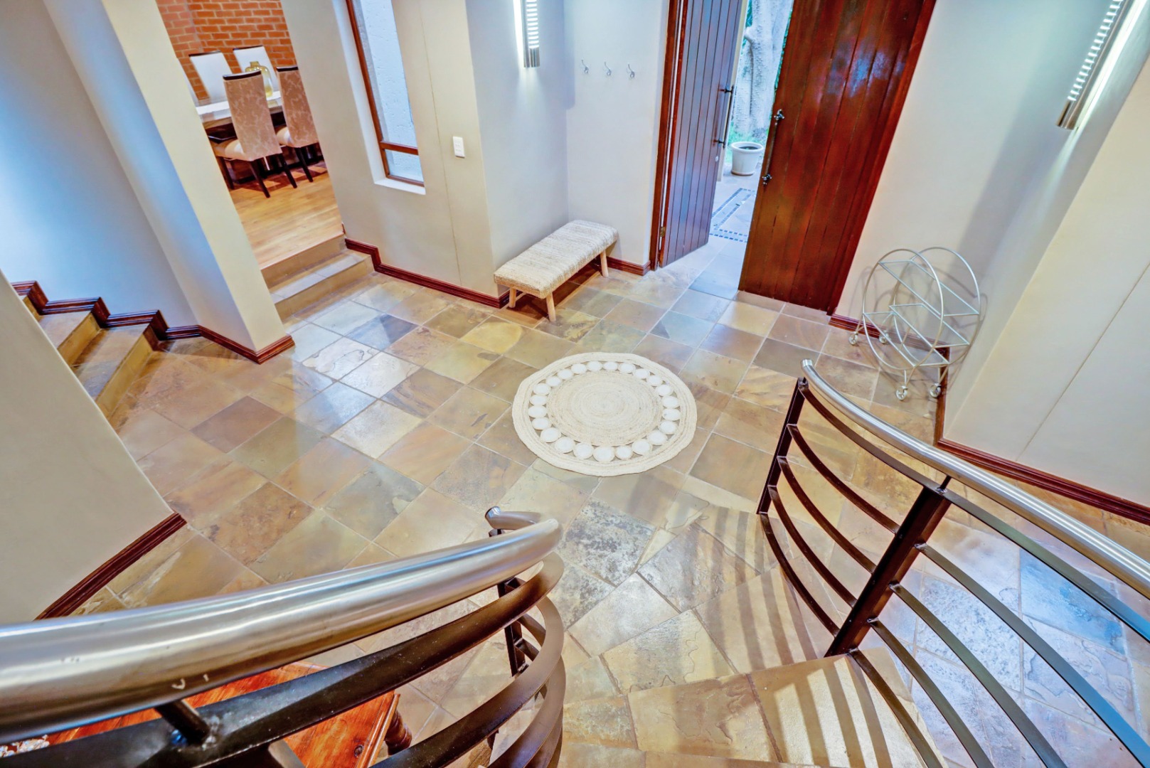 Step into this magnificent 4-bedroom, 3-bathroom residence, available for rent in the esteemed Woodhill Golf Estate, Pretoria. The property welcomes you with a grand, arch-covered entrance and a spacious foyer featuring high ceilings and an elegant spiral staircase with modern metal railings, leading to a curved upper-level balcony. This fully furnished home boasts three generous lounges, a dedicated dining room, and a well-appointed kitchen, providing ample space for comfortable living and entertaining. The interior showcases a blend of modern design and rustic charm with durable tiled flooring and contemporary fixtures.