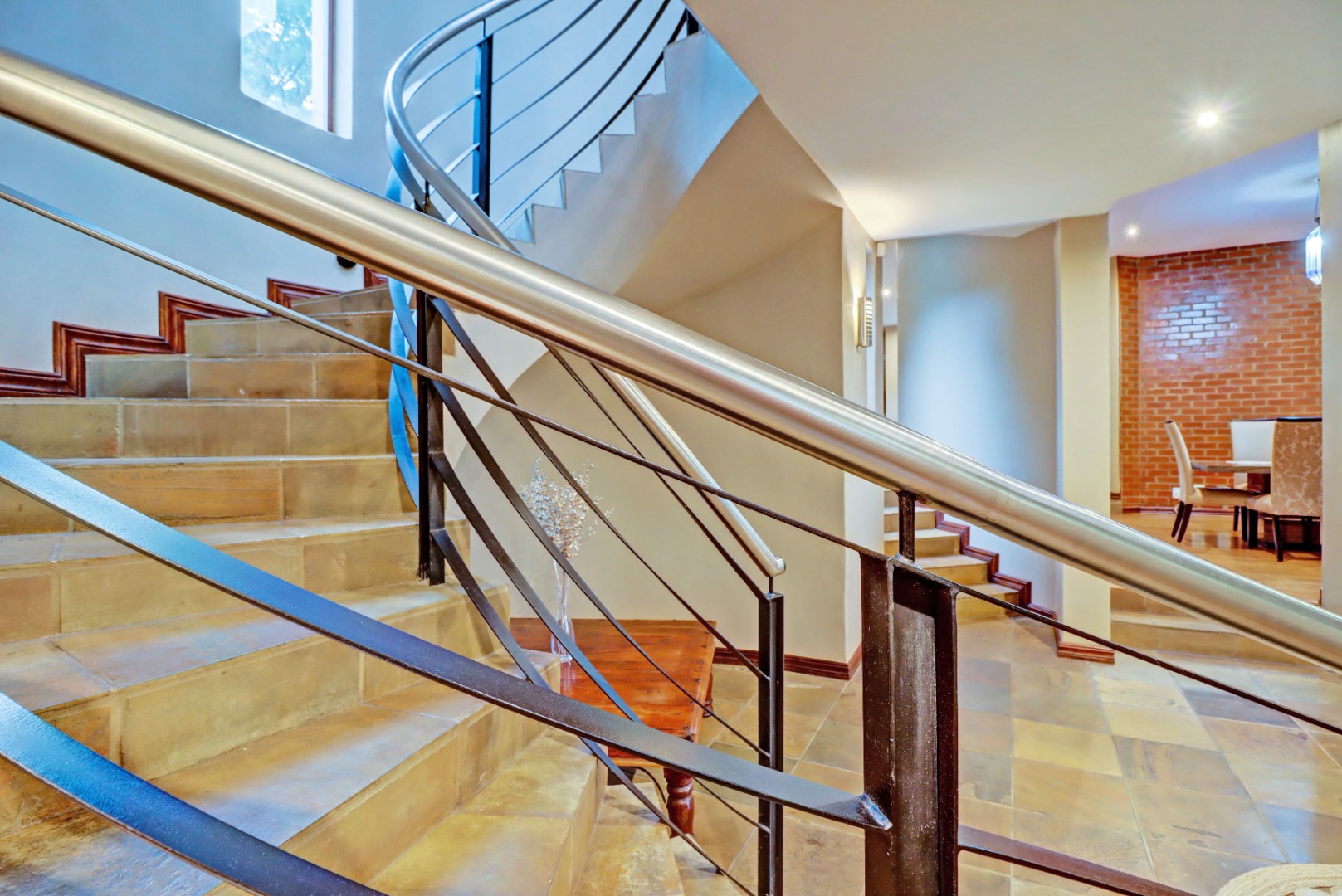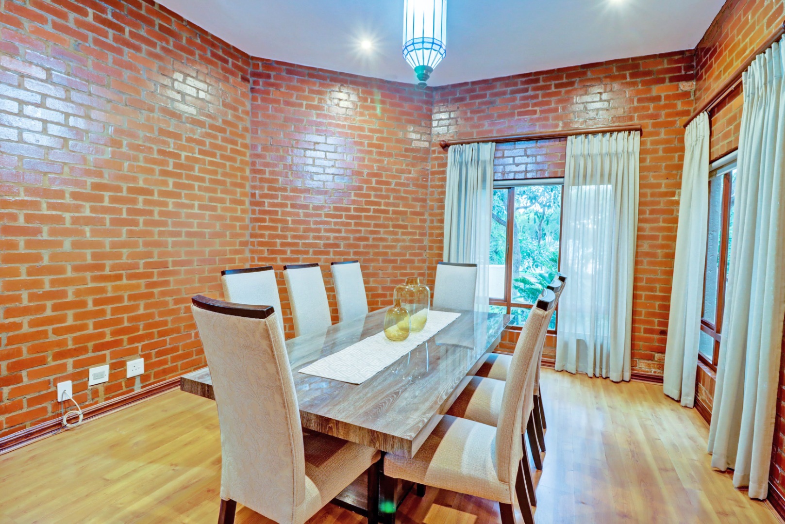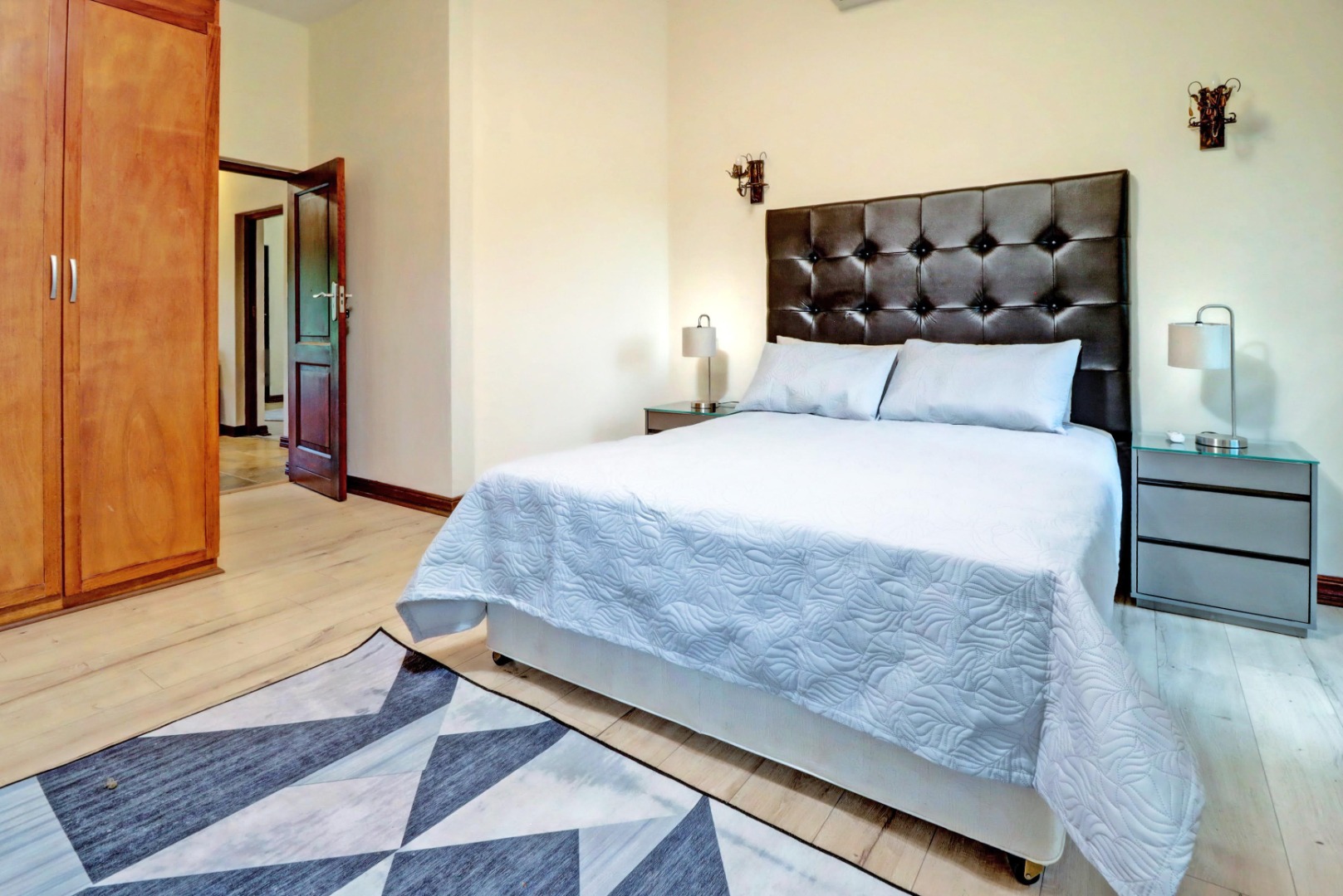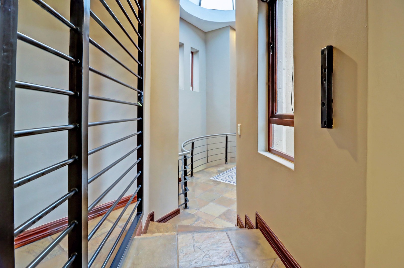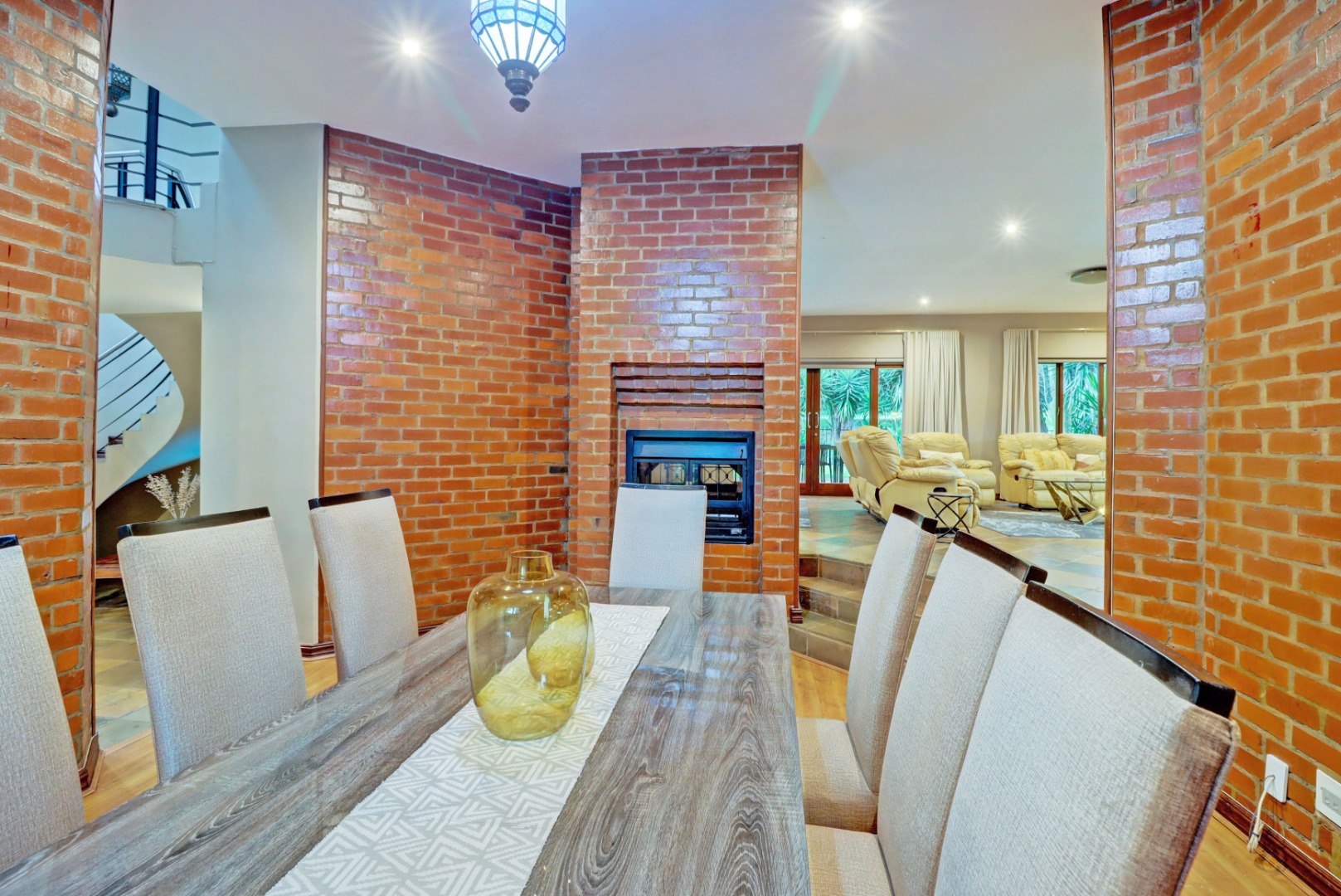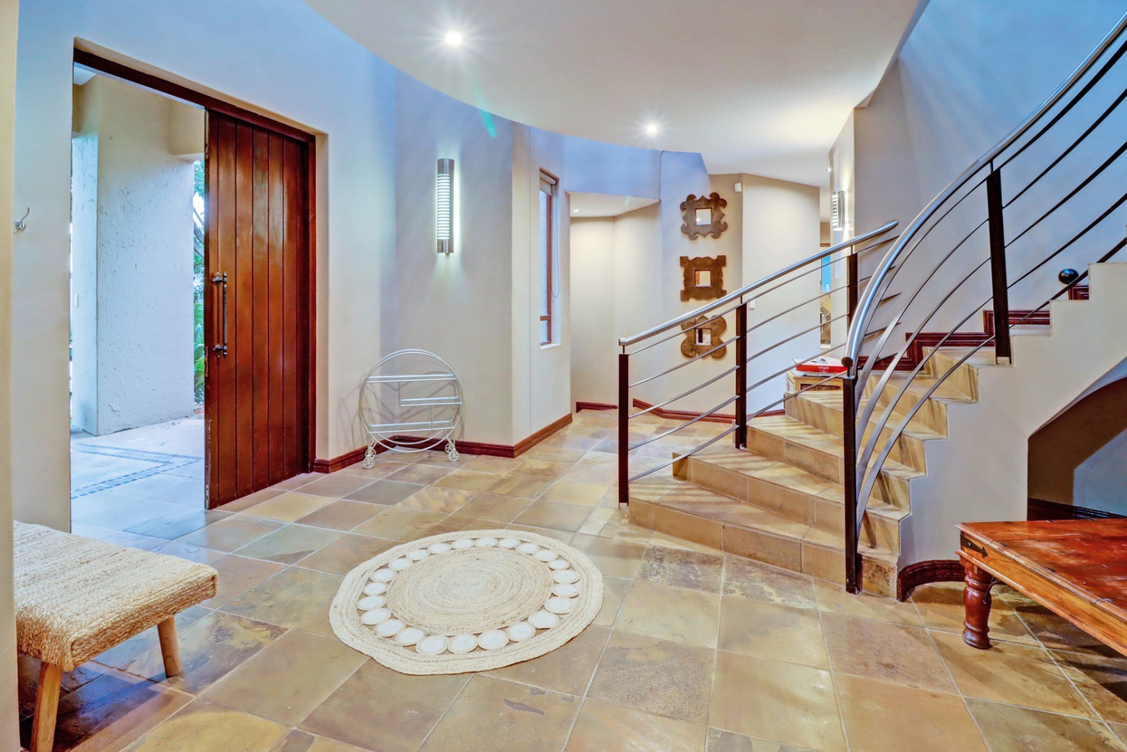 Step into this magnificent 4-bedroom, 3-bathroom residence, available for rent in the esteemed Woodhill Golf Estate, Pretoria. The property welcomes you with a grand, arch-covered entrance and a spacious foyer featuring high ceilings and an elegant spiral staircase with modern metal railings, leading to a curved upper-level balcony. This fully furnished home boasts three generous lounges, a dedicated dining room, and a well-appointed kitchen, providing ample space for comfortable living and entertaining. The interior showcases a blend of modern design and rustic charm with durable tiled flooring and contemporary fixtures.