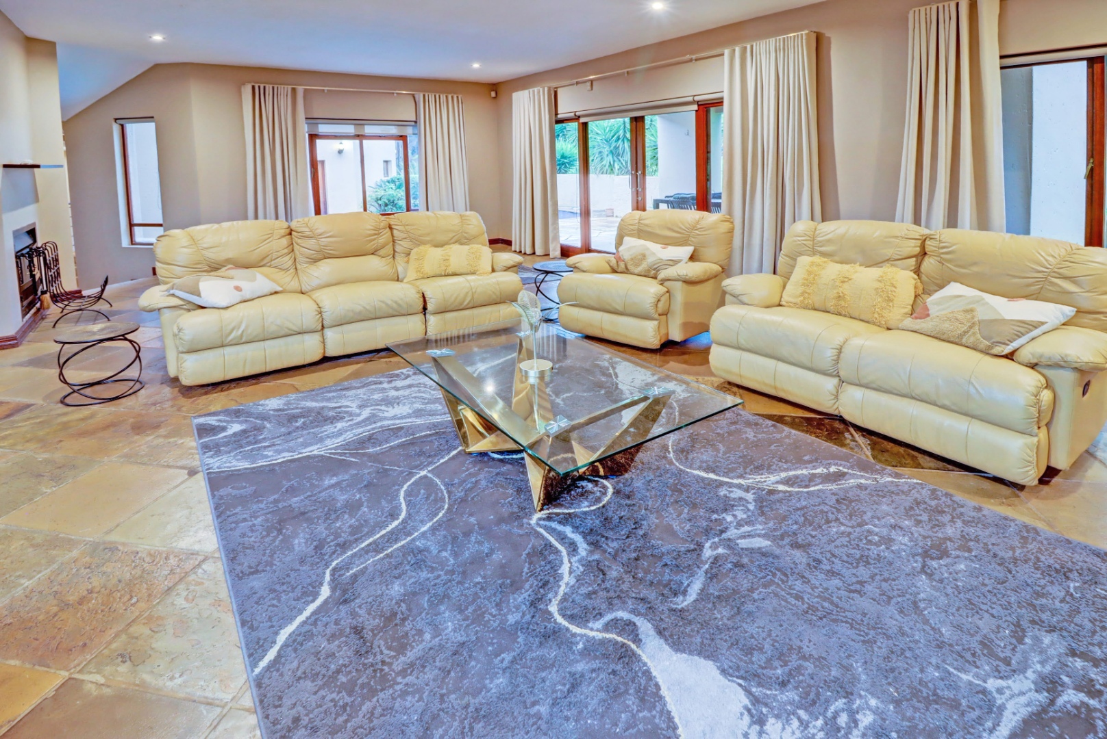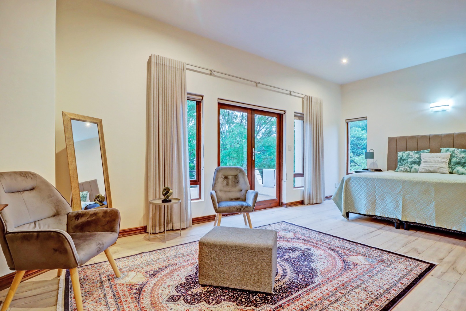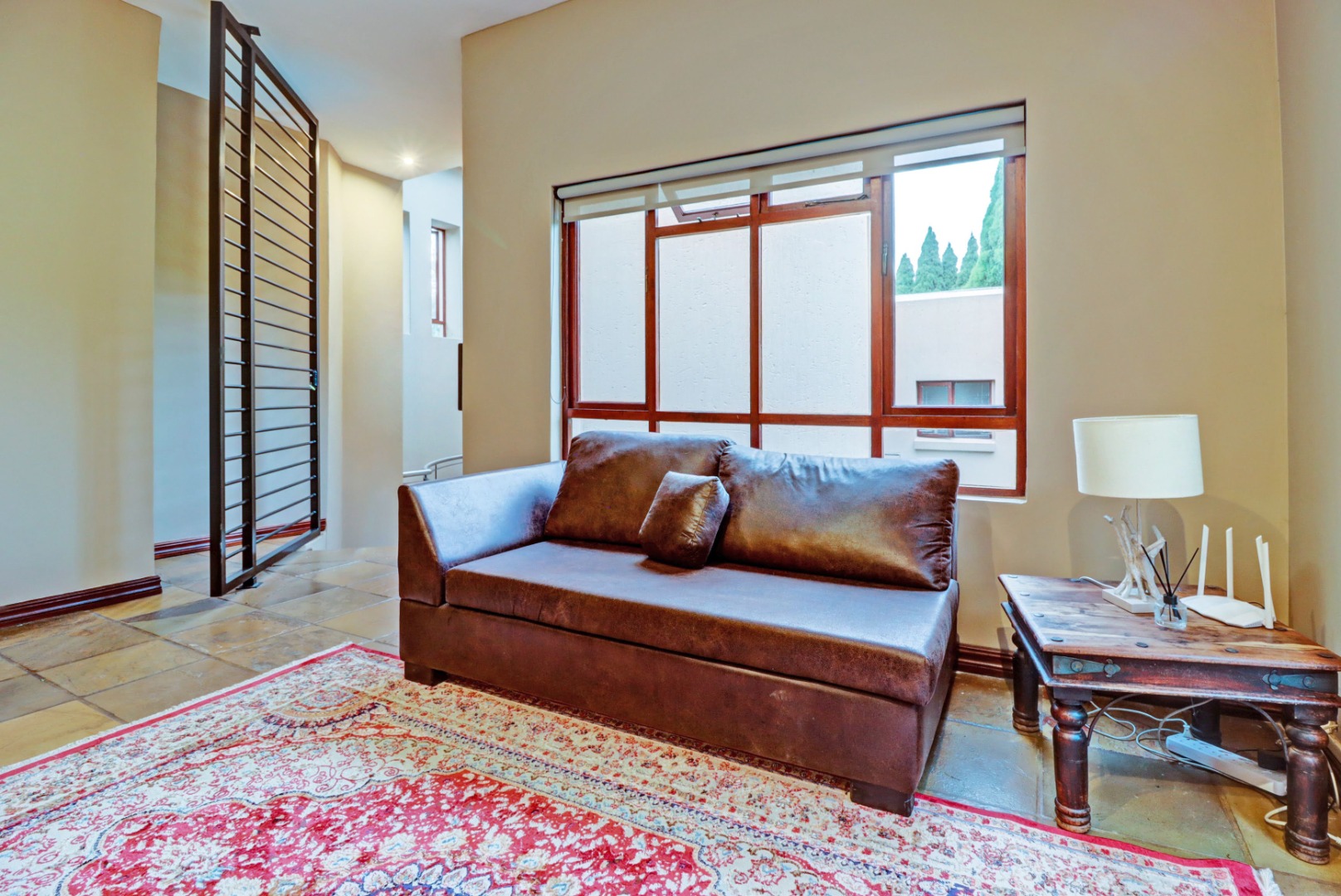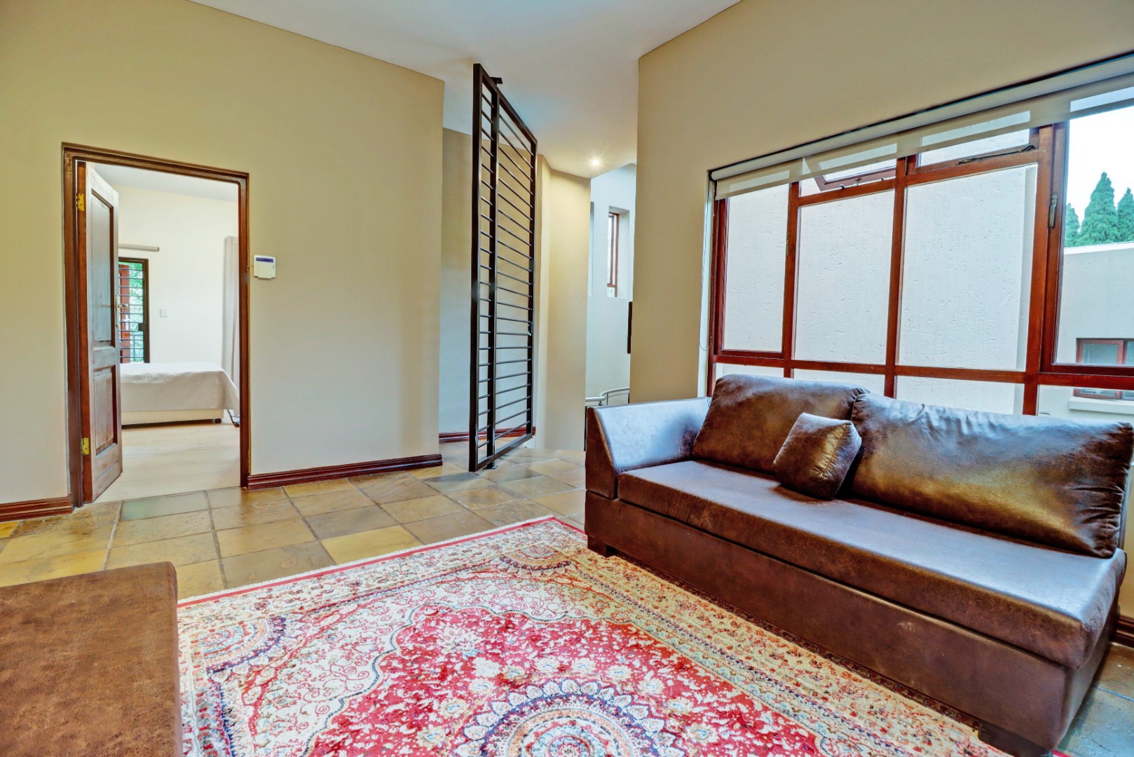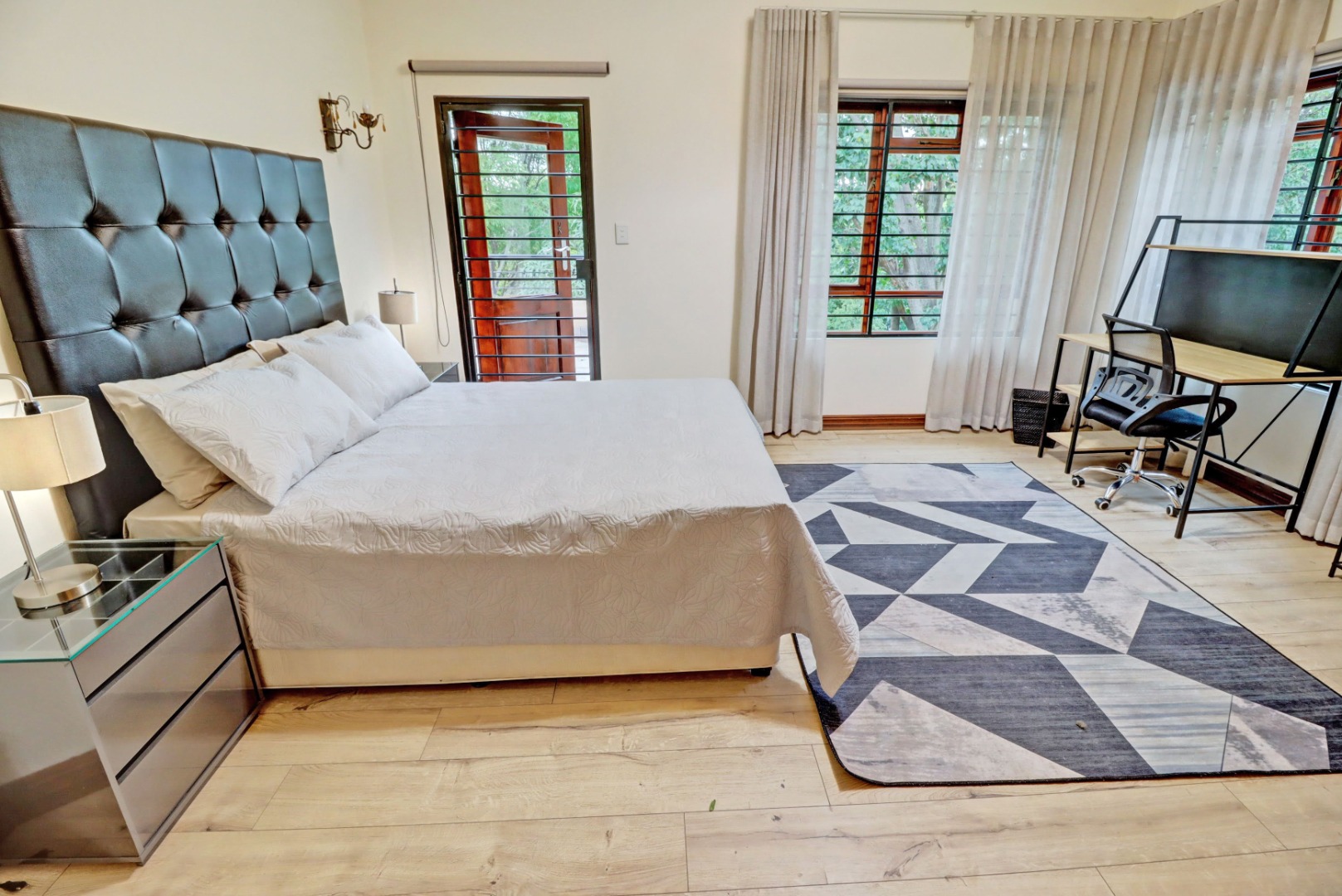 Step into this magnificent 4-bedroom, 3-bathroom residence, available for rent in the esteemed Woodhill Golf Estate, Pretoria. The property welcomes you with a grand, arch-covered entrance and a spacious foyer featuring high ceilings and an elegant spiral staircase with modern metal railings, leading to a curved upper-level balcony. This fully furnished home boasts three generous lounges, a dedicated dining room, and a well-appointed kitchen, providing ample space for comfortable living and entertaining. The interior showcases a blend of modern design and rustic charm with durable tiled flooring and contemporary fixtures.