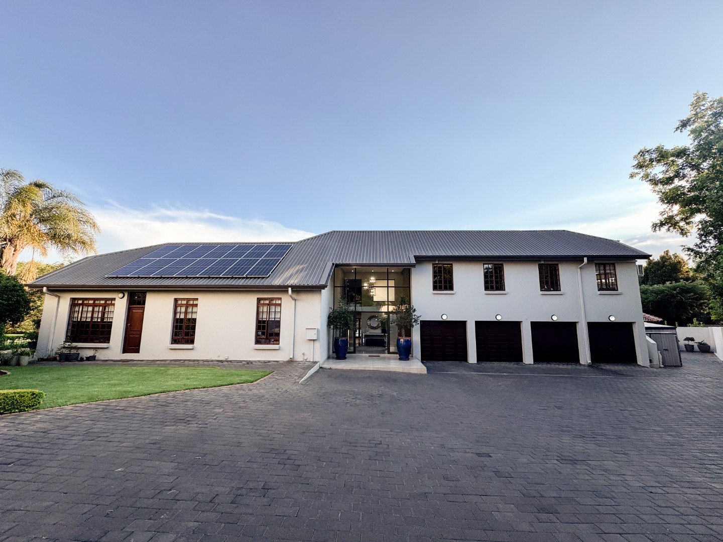 Outside, the property offers a large four-car garage and extensive paved parking. Enjoy the beautifully maintained garden and scenic views, complemented by a built-in braai for outdoor entertaining. As part of a secure golf estate, residents benefit from 24-hour security, access to a club house, and the golf course. Sustainability is addressed with a battery inverter, solar and water tanks, ensuring comfort and efficiency.
