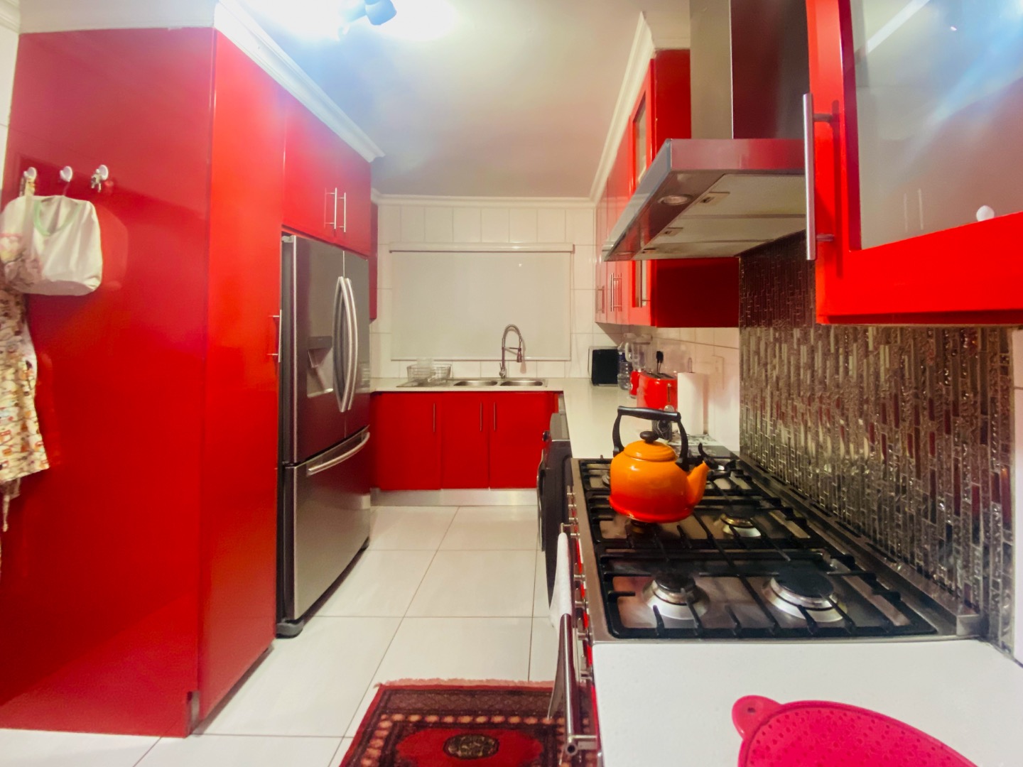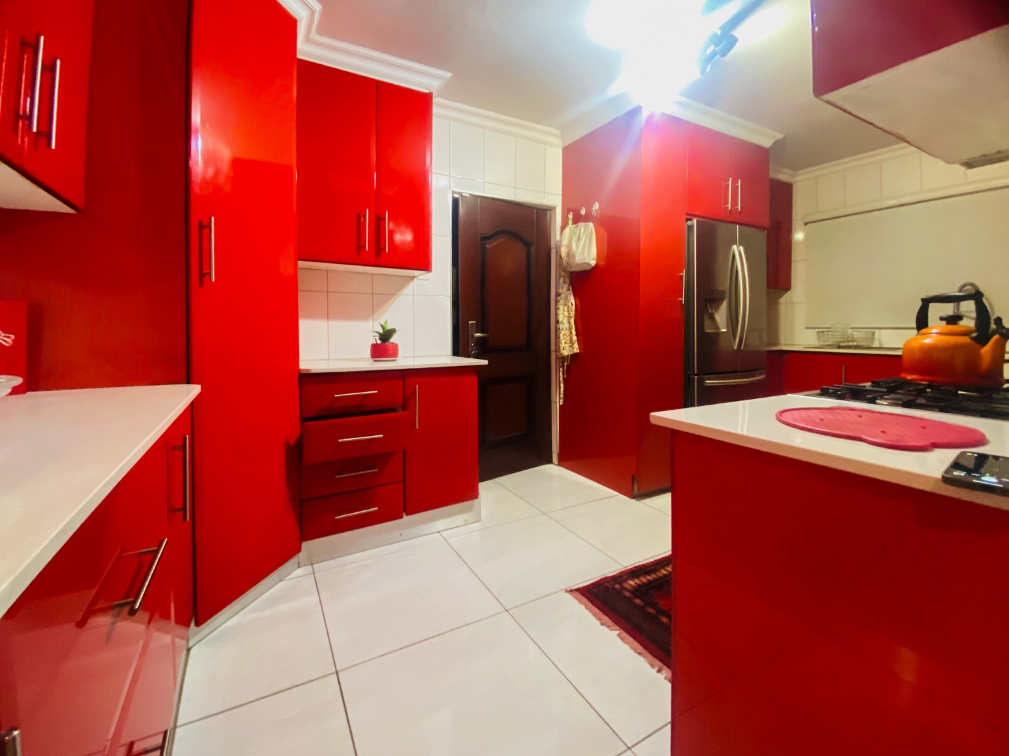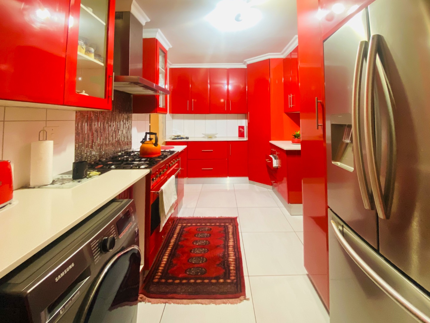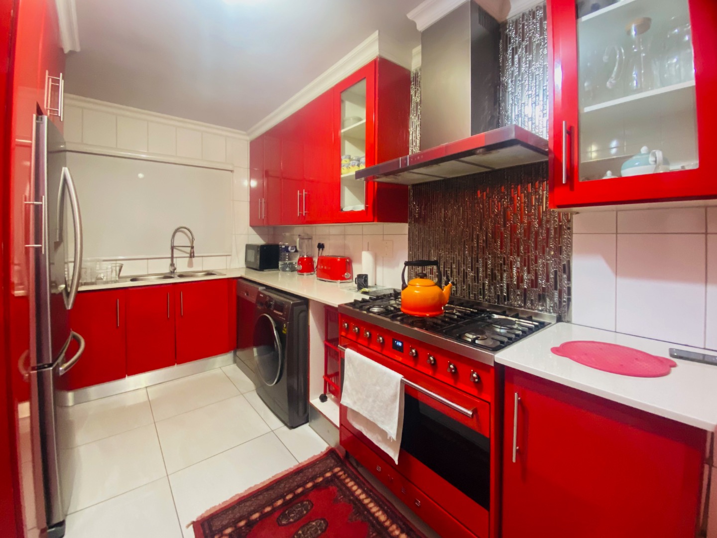Step into a realm of refined living within this home, boasting three generously proportioned bedrooms, including a luxurious en-suite, and two elegant bathrooms, where comfort is paramount. The heart of this residence is its strikingly modern kitchen, a culinary masterpiece featuring vibrant red high-gloss cabinetry, pristine white countertops, and a suite of integrated stainless steel appliances, including a gas range and a convenient washing machine. Two sophisticated lounges and a dedicated dining room provide ample space for both grand entertaining and intimate family moments.