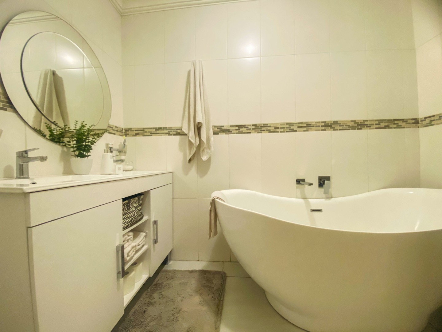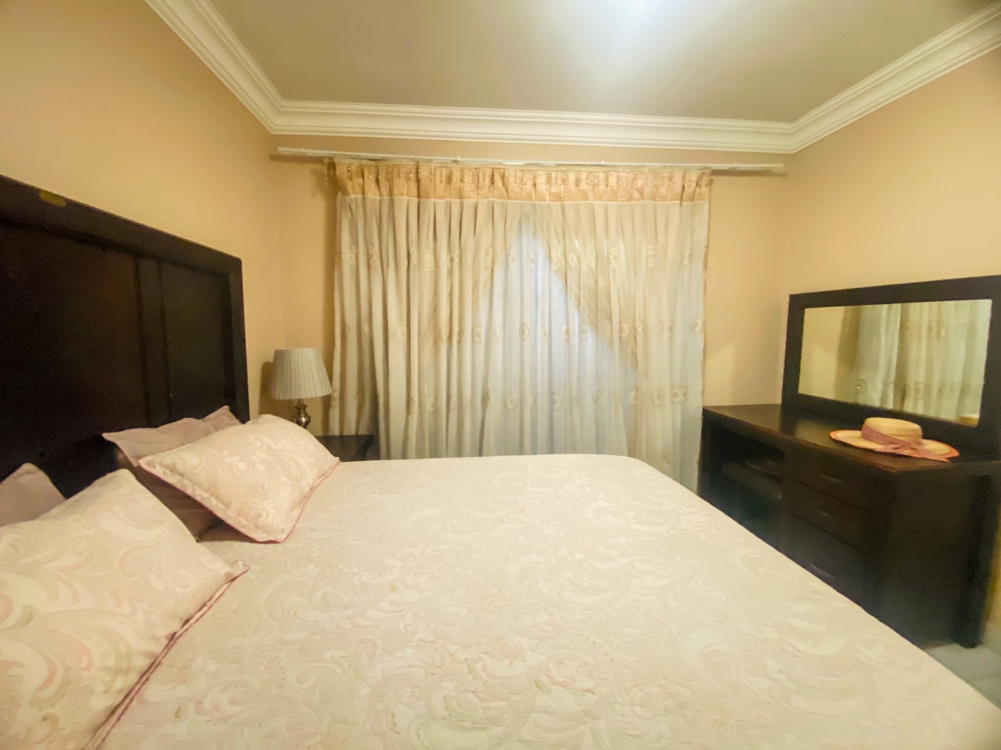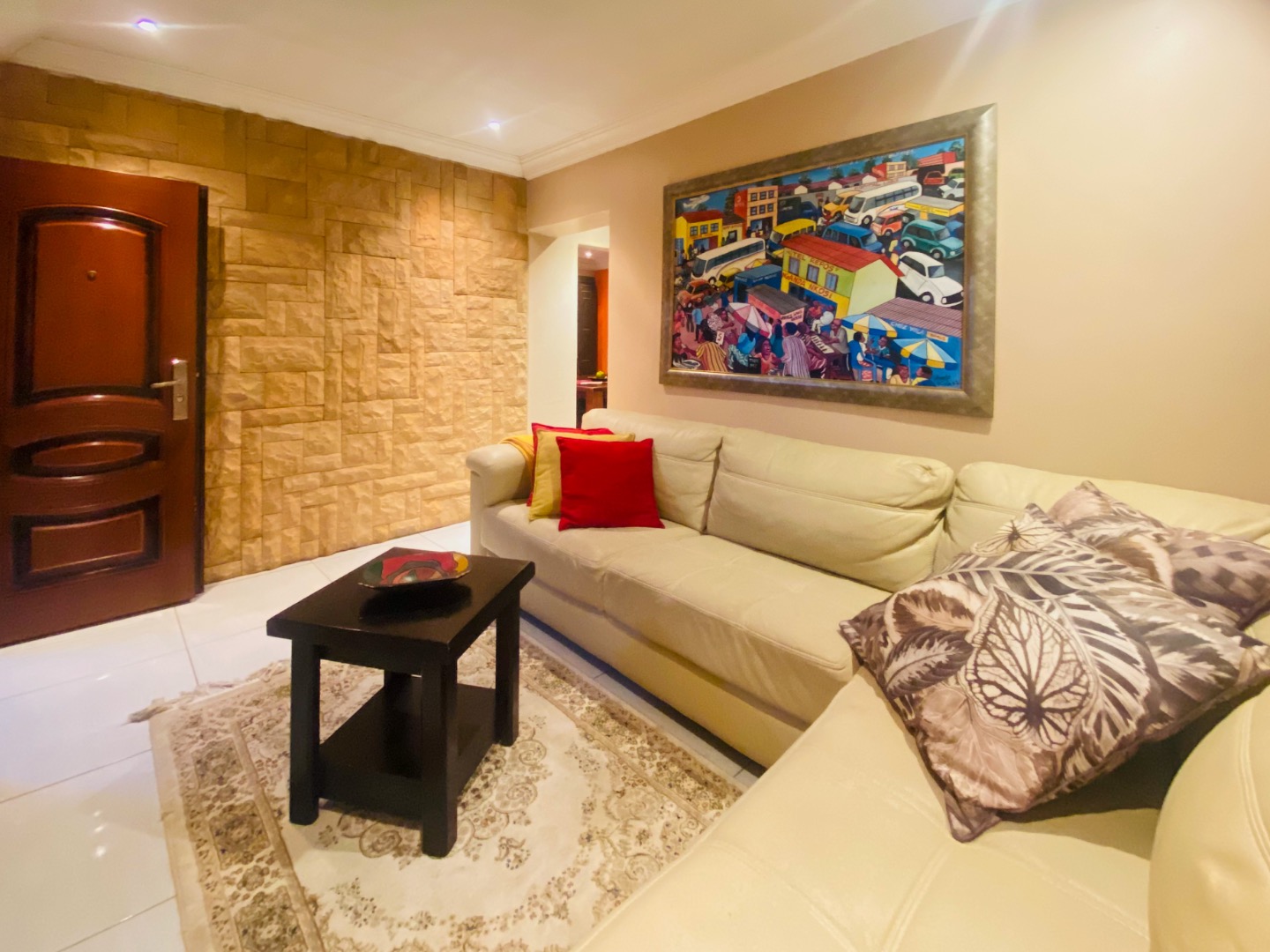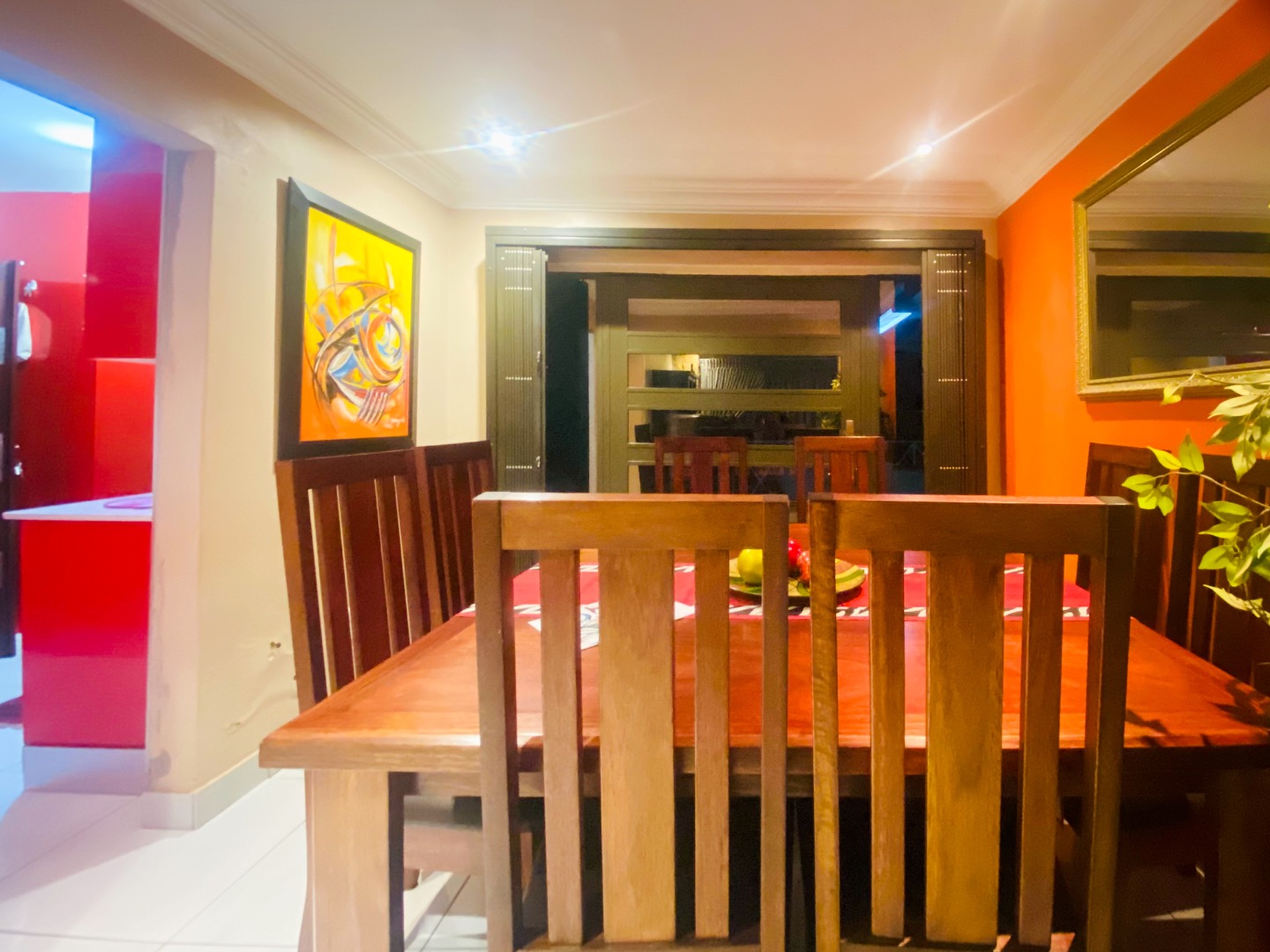Step into a realm of refined living within this home, boasting three generously proportioned bedrooms, including a luxurious en-suite, and two elegant bathrooms, where comfort is paramount. The heart of this residence is its strikingly modern kitchen, a culinary masterpiece featuring vibrant red high-gloss cabinetry, pristine white countertops, and a suite of integrated stainless steel appliances, including a gas range and a convenient washing machine. Two sophisticated lounges and a dedicated dining room provide ample space for both grand entertaining and intimate family moments.