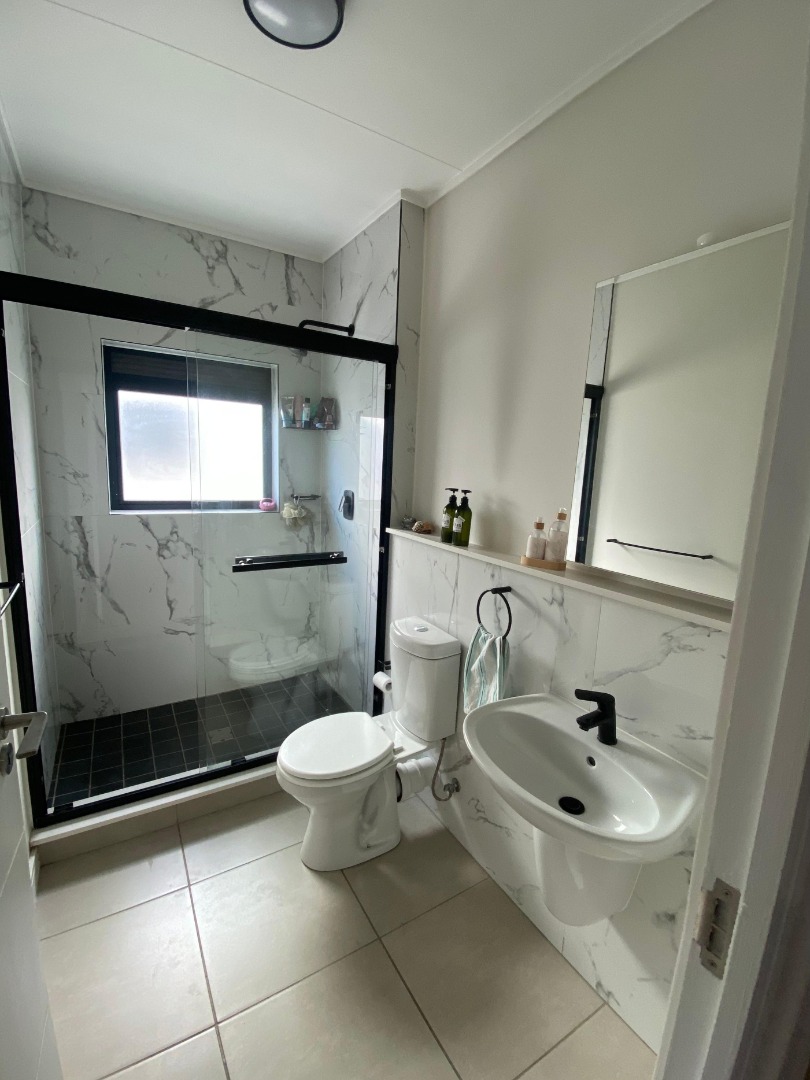 1 Bathroom with shower, basin and toilet.
