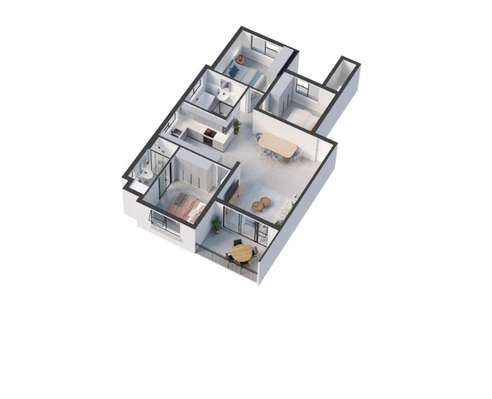 Open plan lounge leading to a balcony, dining area set next to a U-shaped kitchen that comes standard with a washing machine, dishwasher and fridge, electric oven and hob with extractor.